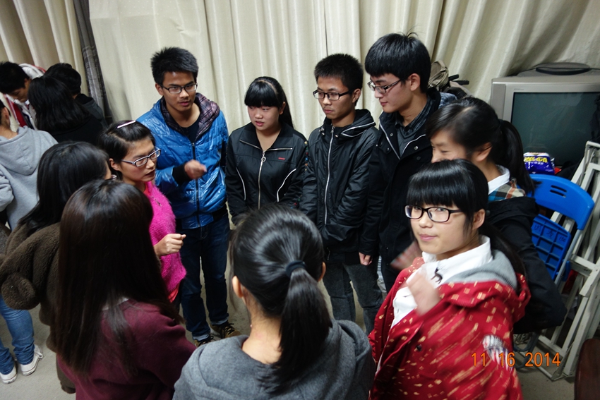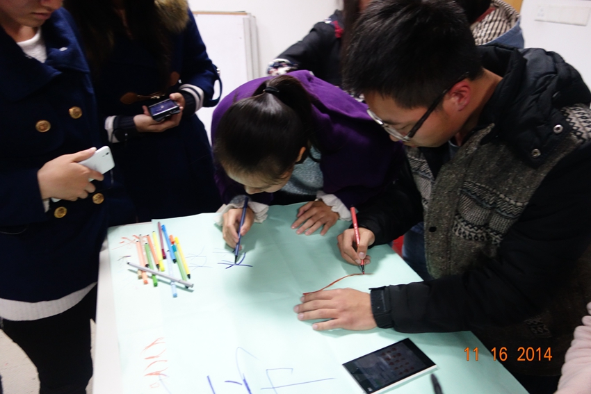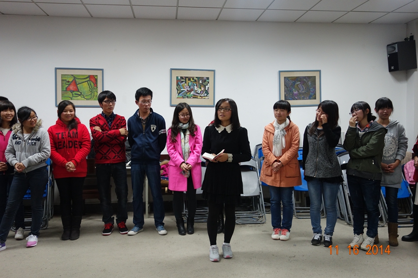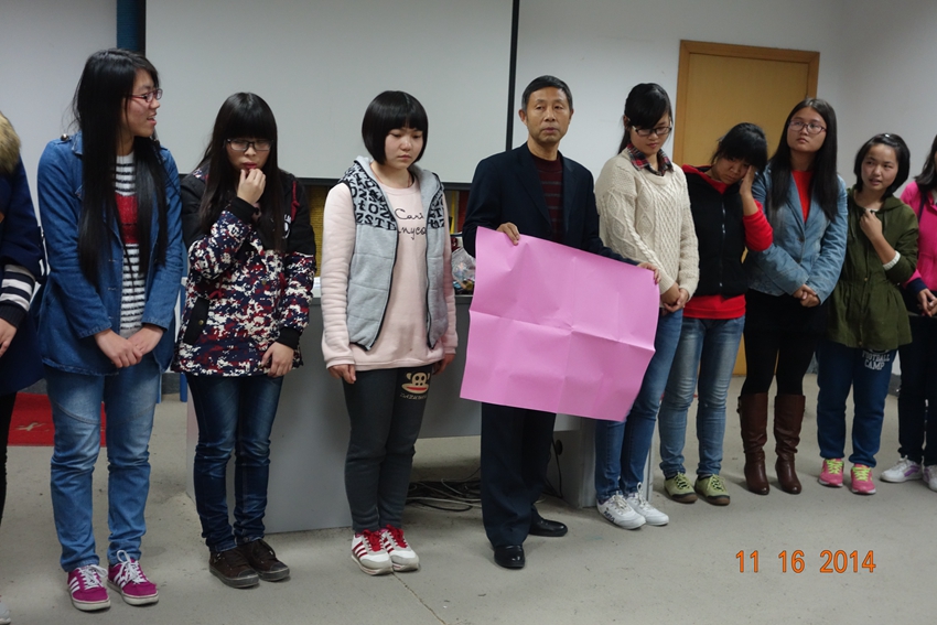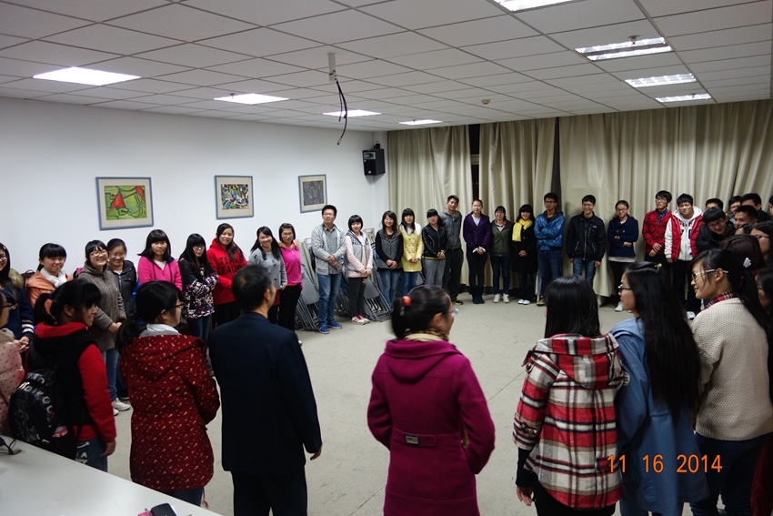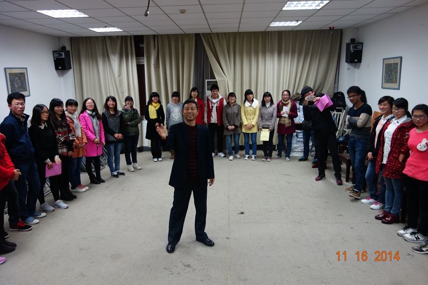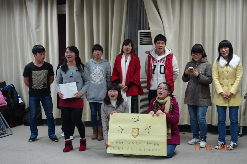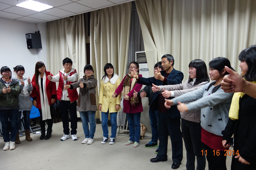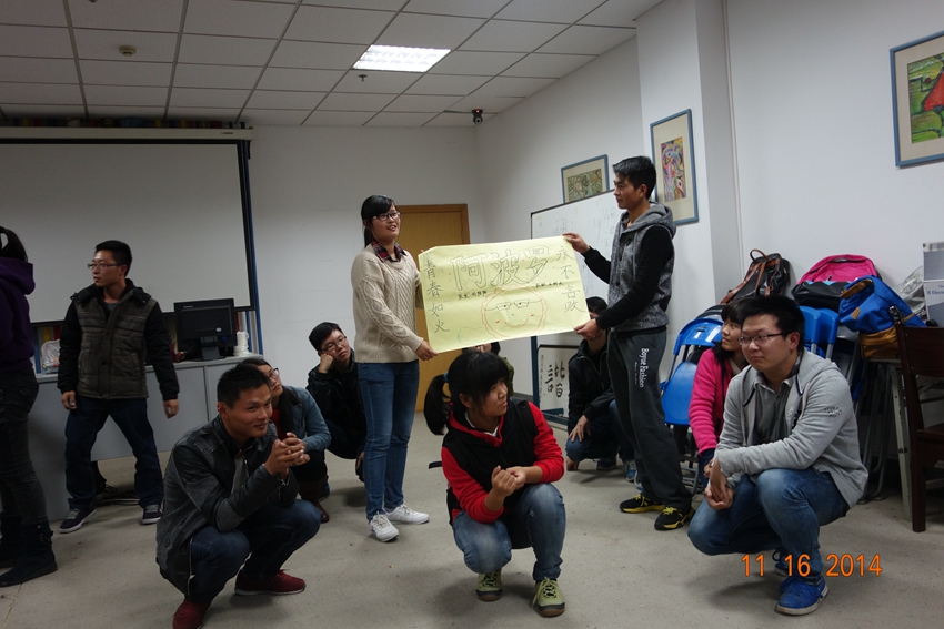 活动一开始认识了几位老师还有瘦西湖校区的分社长,看到优秀优雅的他们,很崇拜,这也是我进大学之后认识了众多学姐学长的感悟。李老师后来火急火燎的赶过来,才到就开始带我们玩了。他很幽默,我是第一次看到这把年纪还能和我们这群懵懂的“孩纸”玩到一起的老师。觉得认识这位老师是我三生修来的缘分。然后一个简单的小游戏,真的是瞬间升温了,不管是身体还是心里。最有趣的就是后来的小组游戏,我记性很差,而且面盲,怎么也不会想到昨晚真的在十分钟之内把另外九个小伙伴的名字兴趣学院给记下来了,感觉自己还是挺厉害的。