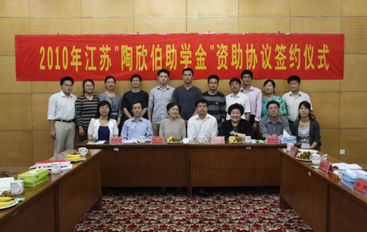 5月26日下午,2010年度江苏陶欣伯助学金”资助协议签约仪式在我校仙林校区芳菲楼举行。江苏陶欣伯助学基金会理事长连桂芳女士、秘书长刘萍女士以及基金会有关工作人员,我校党委副书记吴自斌、学工处相关负责人及学院辅导员代表出席了本次签约仪式。
