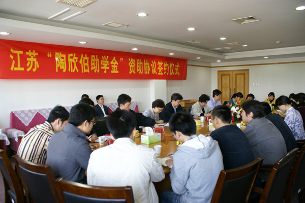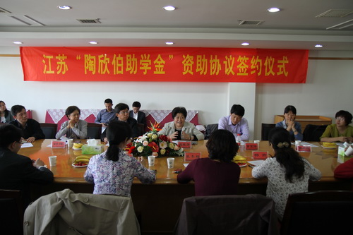 5月24日上午,2011年度江苏陶欣伯助学金”资助协议签约仪式在我校仙林校区厚生楼341会议室举行。江苏陶欣伯助学基金会理事长连桂芳女士、秘书长刘萍女士以及基金会有关老师,我校党委副书记吴自斌、校学工处及各学院相关人员参加了签约仪式。