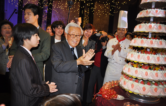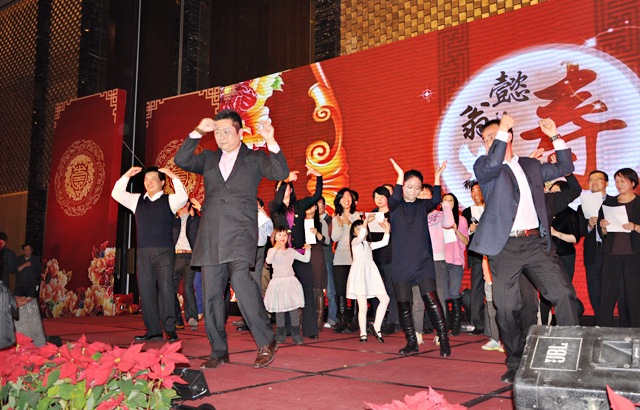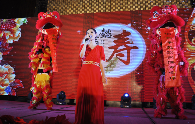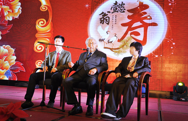 晚六时半,五百六十余名嘉宾齐聚一堂,宴会由南京江宁允公小学的千手观音舞”开场。南京江宁允公小学是陶欣伯先生家乡的一所小学校,由陶欣伯先生于1991年出资重建。在小朋友们的祝福声中,陶欣伯先生与他的两位孙子一起登台致词。