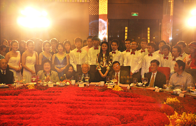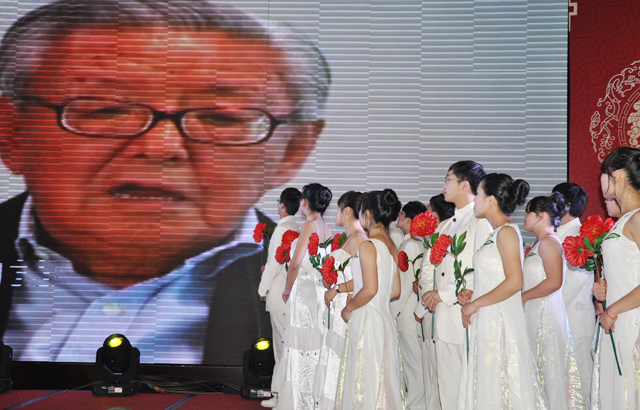 在全体陶学子的《相亲相爱》的歌声中,陶学子代表向陶先生献上了火红的花束。这鲜艳的花束,象征着陶学子大家庭对陶爷爷的爱盛开不败,也意味着江苏陶欣伯助学基金会的工作,将在陶先生的指引下蓬勃发展下去。