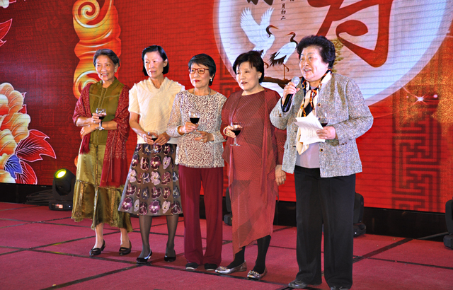 最后,陶先生的四位女儿及江苏陶欣伯助学基金会理事长连桂芳女士共同登台,代表陶欣伯家人、代表江苏陶欣伯基金会感谢大家多年以来对基金会工作的支持。连理事长说,这充满了浓浓亲情、乡情的寿宴,让这位一生充满传奇的老人感受到了欢乐和幸福。有了项目合作学校的支持,陶先生培养陶学子的计划才能顺利进行,达到成功的目标才有保证。