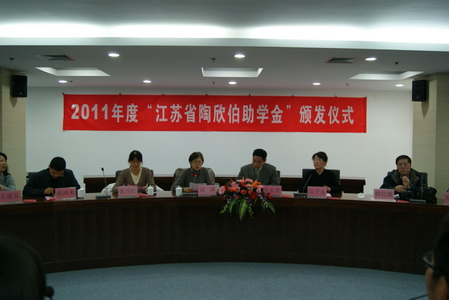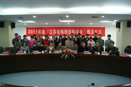 12月12日下午,2011年度江苏陶欣伯助学金”颁发仪式在江宁校区图书馆五楼会议室隆重举行。江苏陶欣伯助学基金会刘萍秘书长、张月红老师和殷民德老师,我校王长青副校长、相关学院总支副书记、学工办老师、获助学生参加了本次颁发仪式。颁发仪式由学生工作处江宁玉副处长主持。