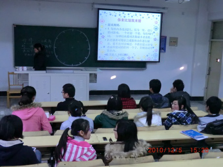 12月5日下午2点,行健社社团成员成功举办了一次团体心理辅导”活动,目的是促进社团成员间的情感交流,为以后开展社团工作奠定基础;同时,因为临近期末,很多同学都面临着期末考试的压力,为了能够缓解大家的心理压力,以轻松的状态投入到学习生活之中,在程龙、张翔、刘亚娟的帮助下,行健社负责人策划组织了这次团体辅导活动。
