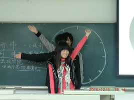 第二个环节是扮时钟”:在黑板上画一个大的时钟模型,分别将时钟的刻度标识出来; 每组内各选出3个代表,分别扮演时钟的秒针、分针和时针,在时钟前面站成一纵列(注意是背向时钟,扮演者看不到时钟模型); 任意说出一个时刻,比如现在是3小时45分15秒,要三个分别扮演的人迅速将手臂指向正确的位置,每组一分钟,成绩最好者获胜。