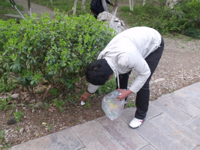 志愿者在栖霞山的身影遍布于风景区的各个角落。他们用自带的清理工具认真地清理着各个区域的垃圾,不怕脏,不怕累,为奉献游客一个干净整洁的栖霞山而努力工作。经过2个多小时的清理,各个区域里面的垃圾都清理完毕,志愿者们小心翼翼地检查自己所分配到的区域,就是为了确保自己的工作没有遗漏。