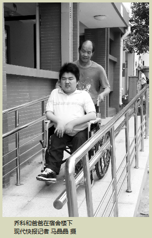 来自沭阳的乔科昨天被父母用轮椅推着,进入距离教学楼最近的一栋研究生宿舍。记者看到,这间宿舍与其他宿舍不同,没有上床下桌的布局,只有两张单人床,洗漱间里还设有淋浴间,足有一二十平方米,几乎比其他学生的宿舍大一倍。