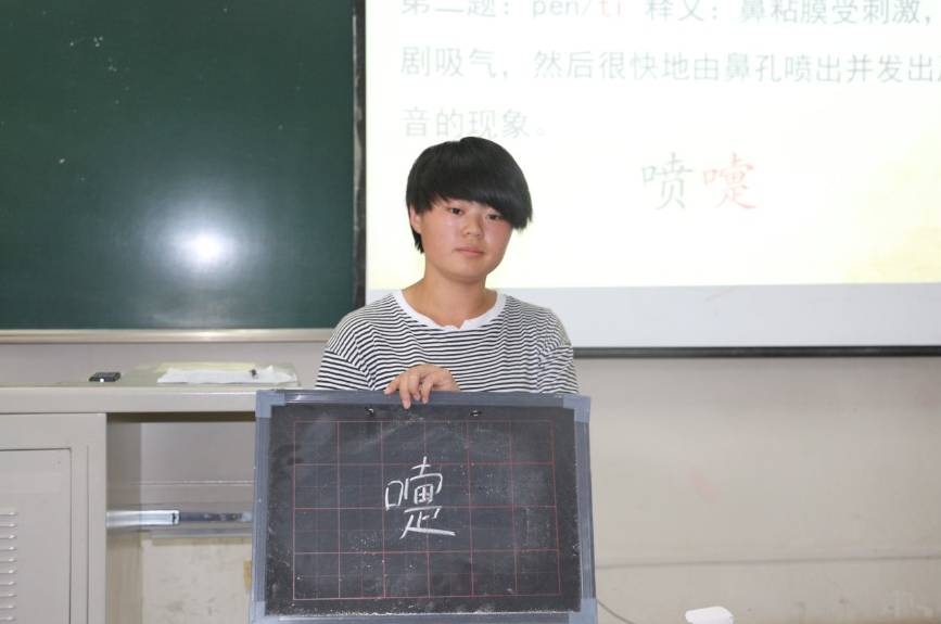 在主持人王仁娣介绍了评委及赛制规则之后,比赛便在大家热烈的掌声中进入了第一个环节――汉字听写环节。主持人念出ppt上所要听写词语中的字,并解释出词语的意思,选手面对观众并要在规定时间内在小黑板上正确写出听到的字,由评委判断书写正误。在这个环节里,各个团队表现得都异常出色,大部分小组都正确写出了所有汉字,即使像“分蘖(niè)、瘘(lòu)管、冰撺(cuān)”这样少见的字词都不在话下。有几位选手虽然有些紧张,不过也都很快进入了状态,取得了不错的成绩,可见大家都提前做好了充分的准备。