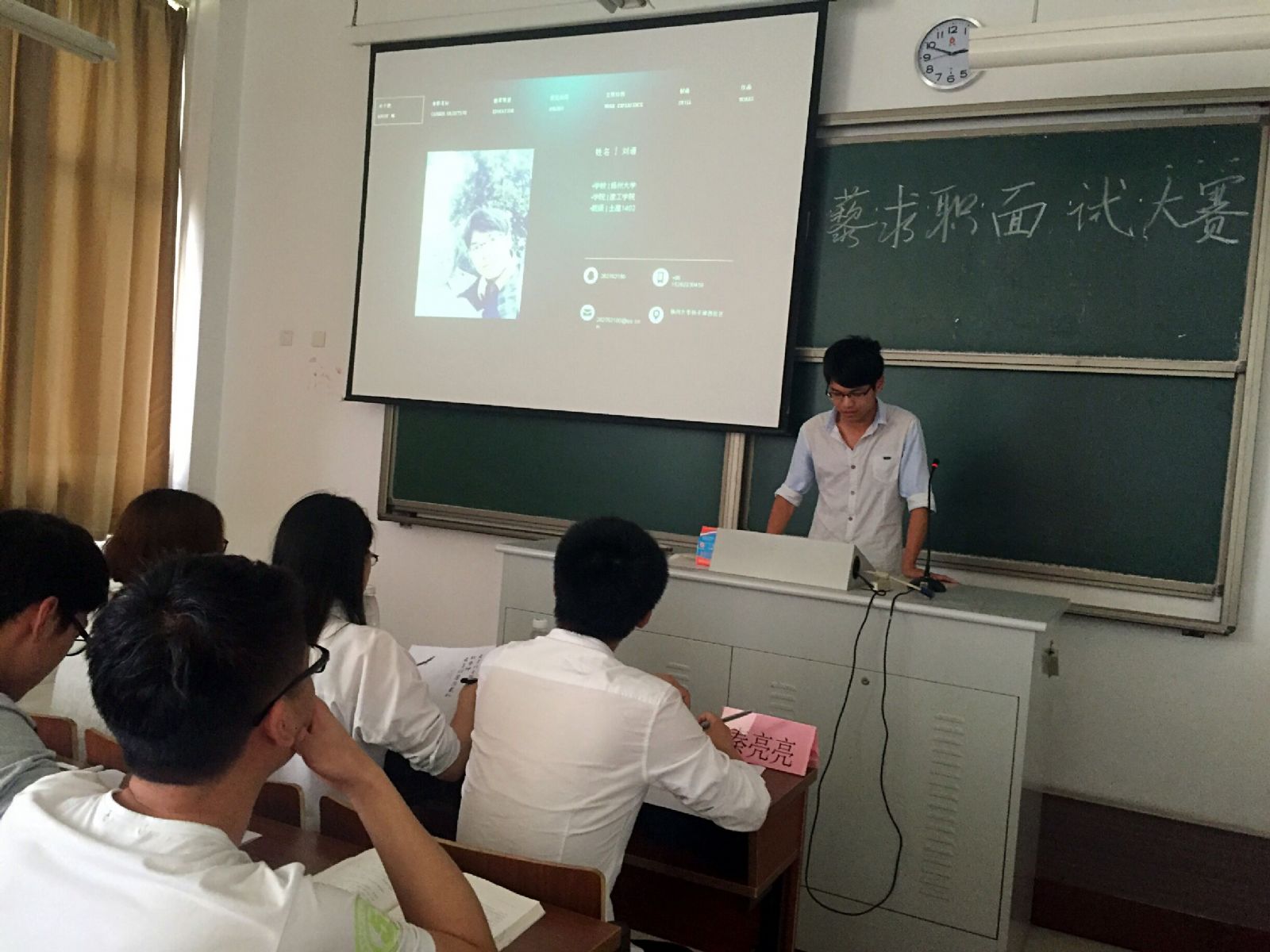 本次大赛模拟伯藜有限责任公司招聘员工。一共招聘四个职位,分别是策划人员、销售人员、电脑程序员与办公室行政助理。参加比赛的陶学子们依次上场进行自我陈述,并通过展示自己的个人简历,分别从爱好、特长,到求职意向以及在该方面的优势都做了详细介绍,将自己的能力充分显露出来。