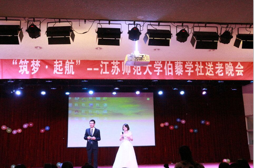 2016年5月28日晚7点,江苏师范大学科文学院大学生活动中心流光溢彩,歌舞飞扬。为丰富陶学子的文化生活,让大四陶学子在离校之际感受到伯藜学社的温暖,也为有才艺梦的陶学子提供一个展示自己的舞台,提高陶学子的文艺素养,江苏师范大学伯藜学社“筑梦·起航”送毕业生晚会在这里拉开帷幕。晚会由综合部和外联部主办,我社社长刘辉和社长助理仝露露担任主持。参加这次晚会的有我社指导老师邵林玉、我社12级即将毕业的在校陶学子以及13-15级全体陶学子。