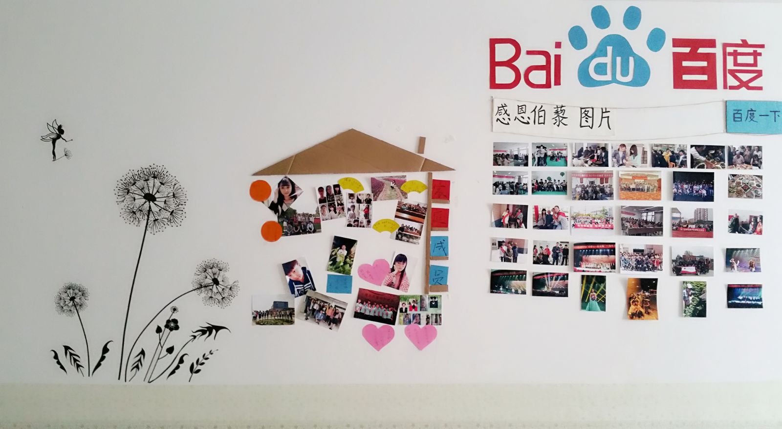 如今,当你走进伯藜小屋,你便会看到右手边的墙上“盐师伯藜学社”鲜艳的红色字样。左手边的墙上则是划分为了以下三个版块:学社成员照片墙、学社活动照片墙和学社小记者团。学社成员照片墙这一版块是一个小房子的形状,学社的陶学子房子下的一家人。学社活动照版块这一版块则模仿了百度的搜索界面,我们在搜索栏里写上“感恩伯藜图片”的字样,下面依次整齐地贴着学社以前举办的活动的照片。最后是学社小记者团的版块,学社里优秀陶学子的个人事迹以及记者团采访时的照片都会会不定期地贴在上面。