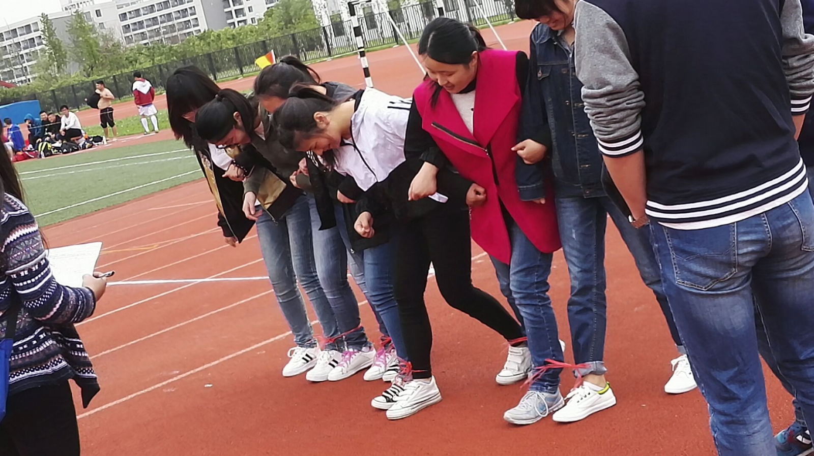 趣味运动分为六种,有跳趾压板、环环相扣、投篮、多人多足、夹气球和九碗不过岗,每一项运动都很有意思,比如跳趾压板有益于身体健康,环环相扣需要队友的高度配合,夹气球可以拉近队友间的距离等。此外,每一项运动结束后,负责人都会根据运动赛的成绩来选取相应的题目数,题目内容很简单,都是南通大学伯藜学社的小常识,比如“学社由多少个部门组成?”“学社成立于哪年哪月哪日?”“学社有多少个社长?”“学社的兴趣小组都有哪些?”等等。