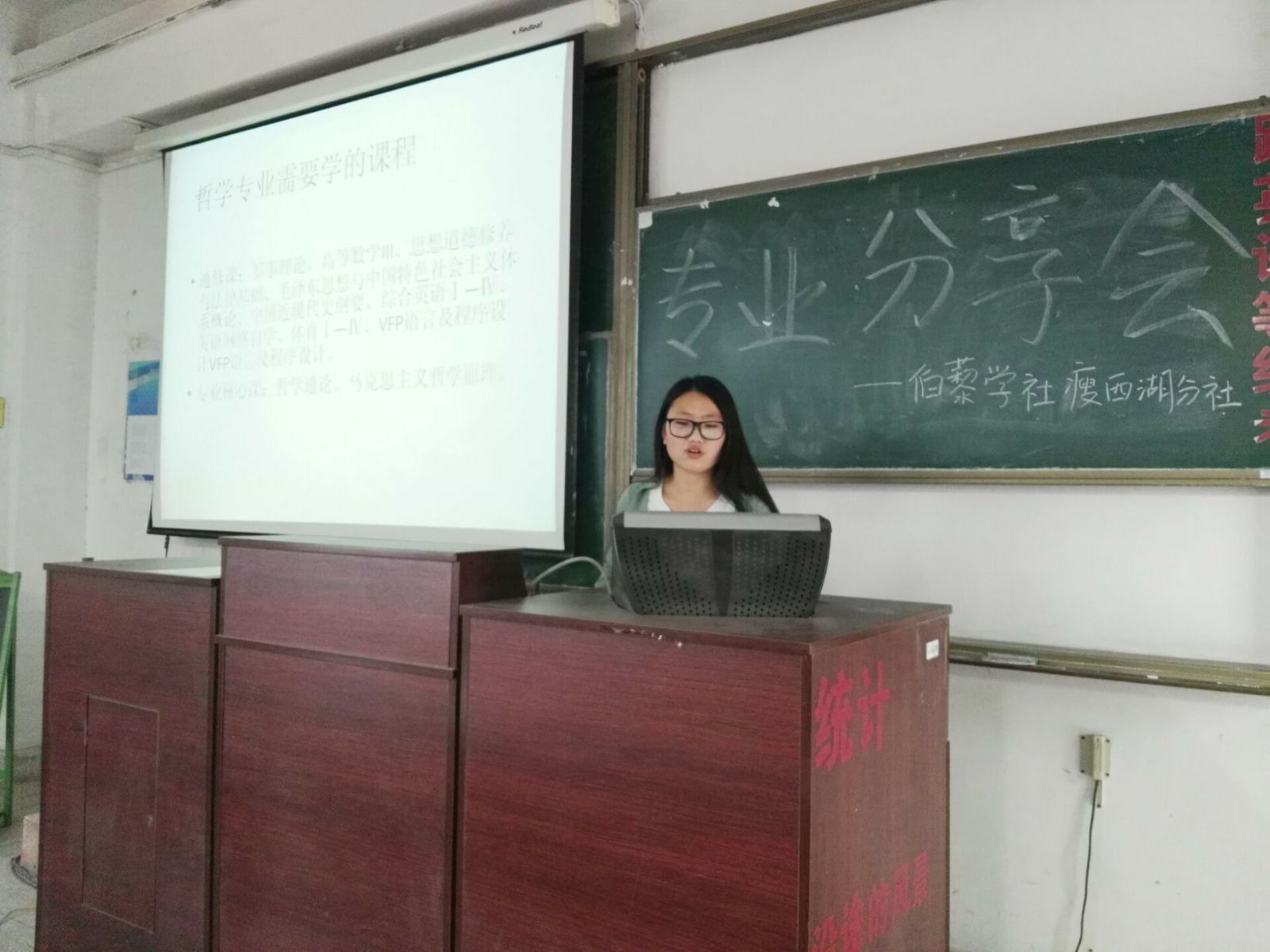首先,由来自社会发展学院的冷梦航分享。她先是讲述了哲学的8个学科设置;然后阐述了“什么是哲学”以及东西方对于哲学定义的理解;接着分析了哲学的三美:“不确定性”、“思辨性”、“无形的力量”。最后她还通过播放视频《吕轻侯说死姬无命》向大家展示了哲学的力量。