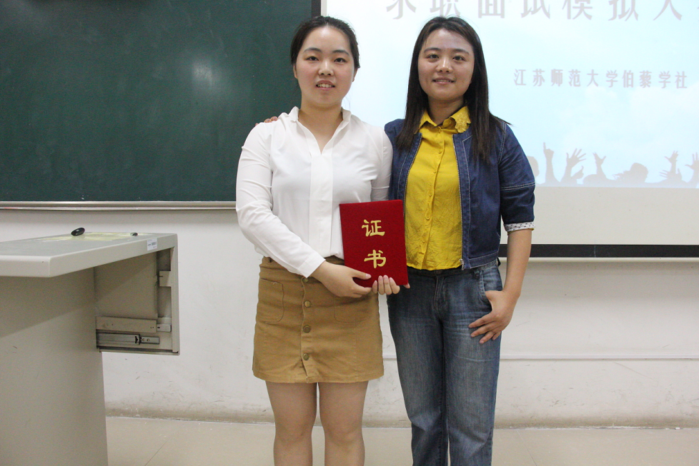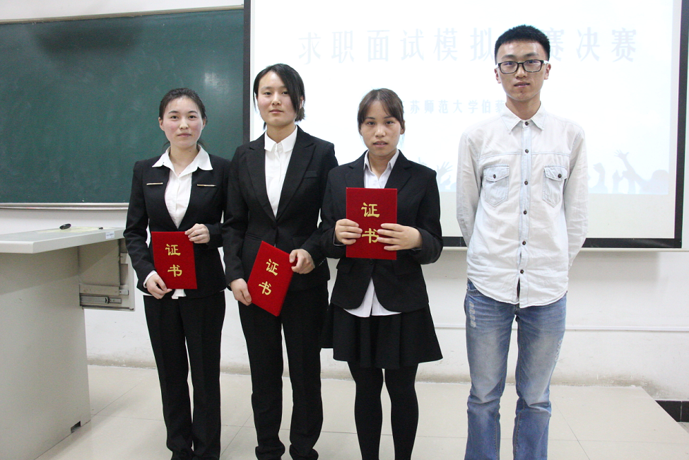 最后,经过评委们综合考量,决定出本次决赛的获奖选手:一等奖张倩,二等奖许正欢、王婷婷,三等奖:李文婧、李佳文、夏维维。相信他们经过此次面试比赛之后,认识到了求职面试中自身存在的不足之处,锻炼了自己的语言表达能力、随机应变的能力,会信心满满的去迎接真正的职场面试。