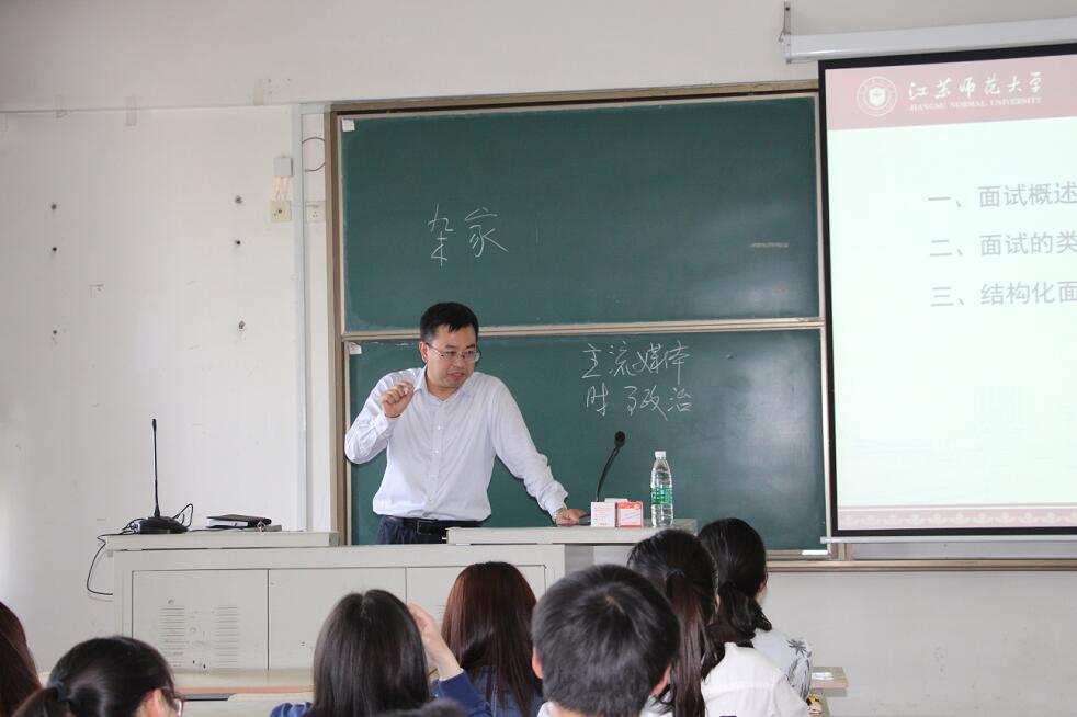 众所周知,就业已经成为当代大学生最为关注的热点问题之一,为了提高陶学子的就业竞争力和求职自信心,学习和掌握更多的求职面试技能和面试礼仪知识,江苏师范大学伯藜学社于2016年5月4日下午2点30分在科文3号楼405教室举办求职面试培训讲座。此次讲座特邀我校学工处崔成前处长主讲,我校学工处彭晨老师和我社指导老师邵林玉出席活动,13、14级陶学子全体参与。