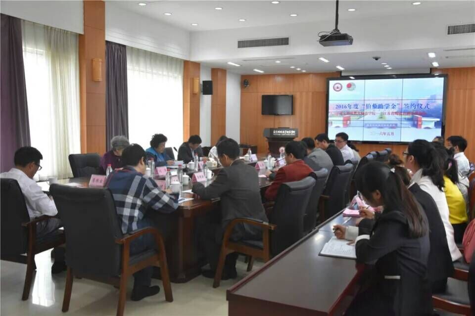 会议第一个议程为2016年度“伯藜助学金”签约仪式,在签约仪式进行之前,双方进行了密切地交流。首先由我校副院长庆祖杰发表致辞,庆院长首先对江苏陶欣伯助学基金会表示衷心的感谢,并表示在伯藜助学金的帮助下,我校陶学子有了更加迅速全面的发展,希望与江苏陶欣伯助学基金会保持长远的合作关系,共同培养越来越多优秀的陶学子。随后,江苏陶欣伯助学基金会张利伟秘书长发表讲话,张秘书长首先对我校领导及各位老师表示了感谢。张秘书长指出,学校与江苏陶欣伯助学基金会同在一个育人平台,希望学校给予更多的意见与建议,也提出江苏陶欣伯助学基金会将秉持“助学创业,立己达人”的理念,大力支持陶学子自主创业,为陶学子们提供更为广阔的发展平台。随后进行签约仪式,江苏陶欣伯助学基金会连桂芳理事长与我校庆祖杰副院长进行2016年度“伯藜助学金”签约仪式。接着,我校各院系党总支书记、学工办主任纷纷发表了各自在学生教育以及陶学子发展方面的想法及感受,提出了许多建设性的建议。最后,江苏陶欣伯助学基金会连桂芳理事长表示,伯藜助学金奖励“品学兼优、贫困有志”的大学生,着力培养对社会有用的人才,也将会为有志气的陶学子们创造更好的发展机会。