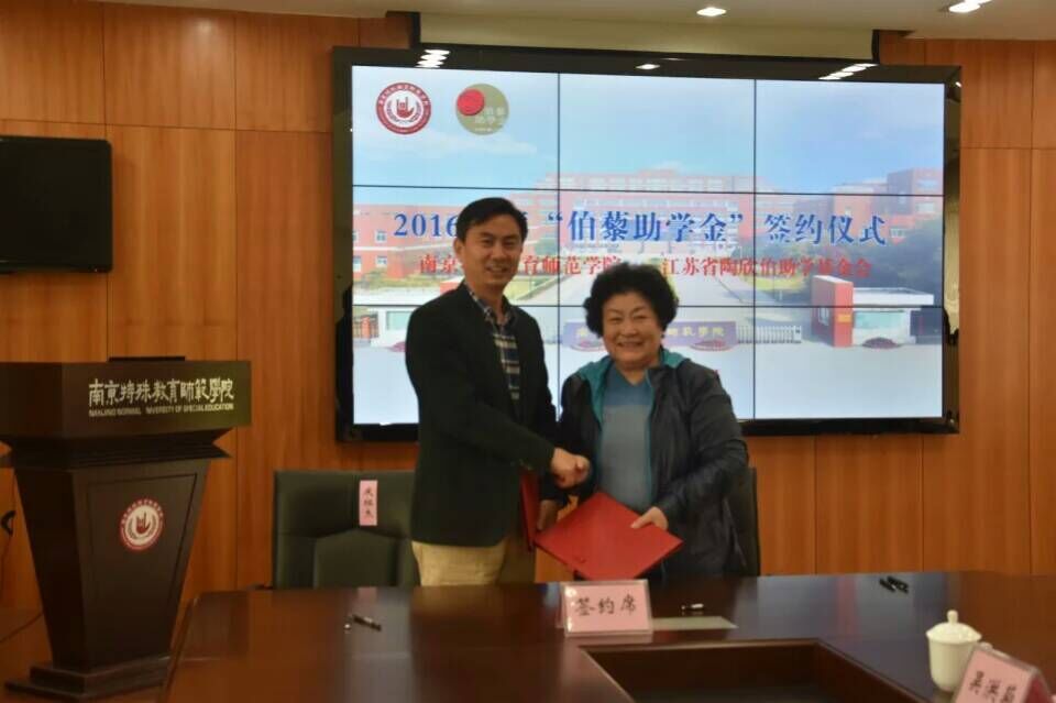2016年5月13日上午,南京特殊教育师范学院伯藜学社2016年度“伯藜助学金”签约仪式暨师生座谈会在我校水上报告厅顺利举办。江苏陶欣伯助学基金会理事长连桂芳、江苏陶欣伯助学基金会秘书长张利伟、我校副院长庆祖杰、江苏陶欣伯助学基金会项目总监刘萍、学生工作处处长王伟、各院系党总支书记、学生工作处副处长李宏伟、江苏陶欣伯助学基金会分管项目负责人高冰宁,各学院学工办主任以及伯藜学社指导老师冷晴出席了签约仪式及座谈会,我校伯藜学社社团骨干及陶学子代表参加了此次座谈会。