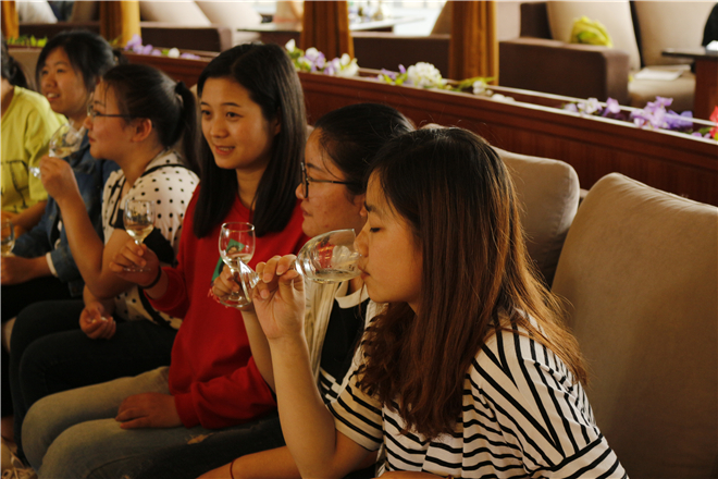 在气氛缱绻的咖啡厅里,陈彦老师着装大方,体态优雅,端着酒杯的手纤细如玉;四位冠军队成员面带微笑姿态端庄地坐于首位;陶学子们人手一只酒杯团团围坐,在陈老师的带领下,慢慢踏入弥漫着葡萄酒香的美妙世界。