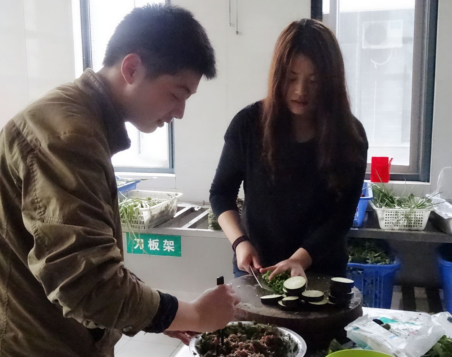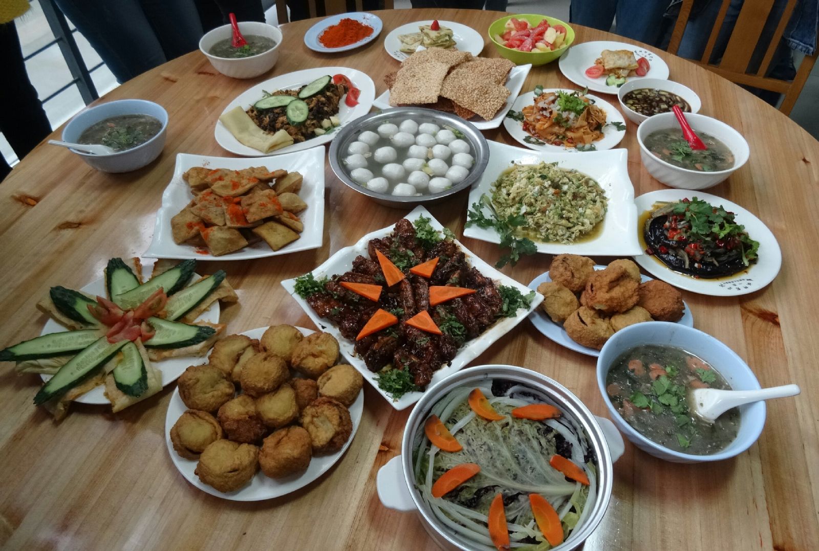学习部部长师影刚宣布比赛开始,各只队伍就已经忙碌起来了,他们都有着明确的分工:洗菜切菜、调制配料、制作美食以及最后的摆盘。比赛期间,各队组员都配合得十分默契,再加上食堂工作人员的热心帮助,各队的美食很快就完成了。不同风味的特色美食摆成一桌,别具一格。评委们依次品尝每只队伍的美食并进行打分,最终,客家队获得了本次家乡菜PK赛的第一名。