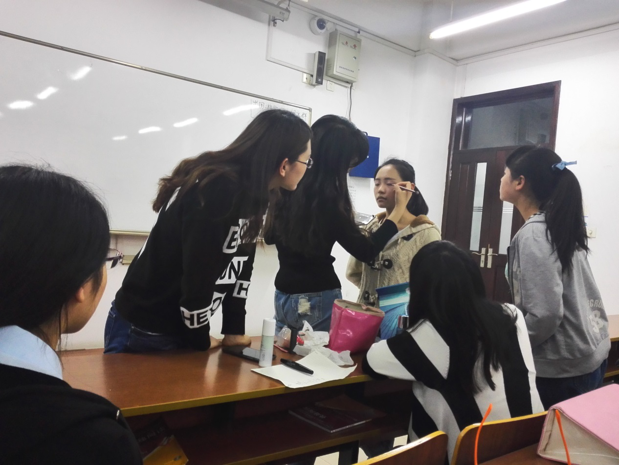 主讲人黄敏选择新宣部成员陈慧作为模特进行试妆演示,在场的陶学子们也在台下积极进行尝试。黄敏首先对陈慧进行了面部清洁,然后依次涂抹润肤水、乳液、隔离霜,最后用散粉定妆。在教授化妆过程中,黄敏也向大家介绍了几种流行妆容,还有各种颜色皮肤分别适合的唇膏等,现场气氛活跃。