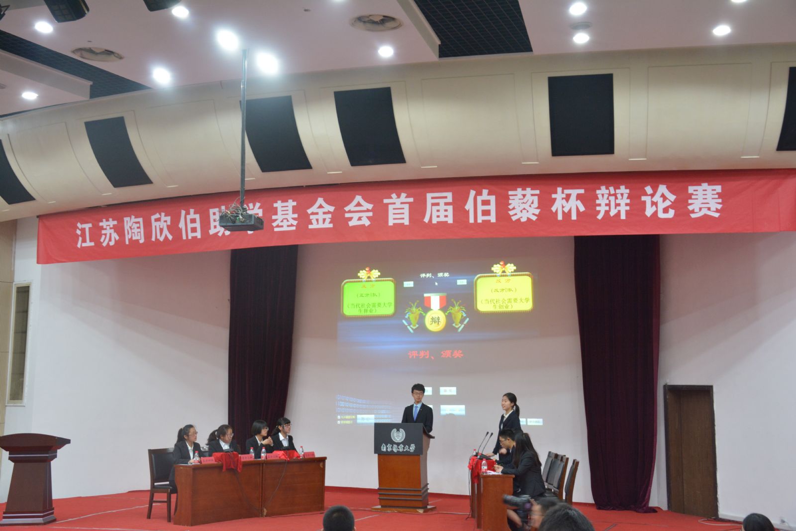 此次辩论赛分为半决赛和决赛。参加本次辩论赛的辩手被分为A、B、C、D四支队伍。半决赛中,A队作为正方,D队作为反方,其中东南大学伯藜学社的陶学子代表宋超予同学作为反方D队的一辩参与了比赛。双方就当代社会需要大学生择业还是就业这一辩题展开辩论。在经过激烈的唇枪舌战之后,正方A队赢得了这场比赛;B队和C队就青年的成才关键是自身能力还是外部机遇展开激烈辩论。整个辩论过程中,会场气氛都十分热烈,辩手们的言辞亮点频出,双方辩手都或攻或守、互不相让,最后反方C队胜出。决赛于当天下午两点开始,A队和C队两支队伍以成大事者不拘小节还是也拘小节为辩题展开辩论,最终作为反方的C队赢得了最后的胜利,并荣获了最佳团队的称号。