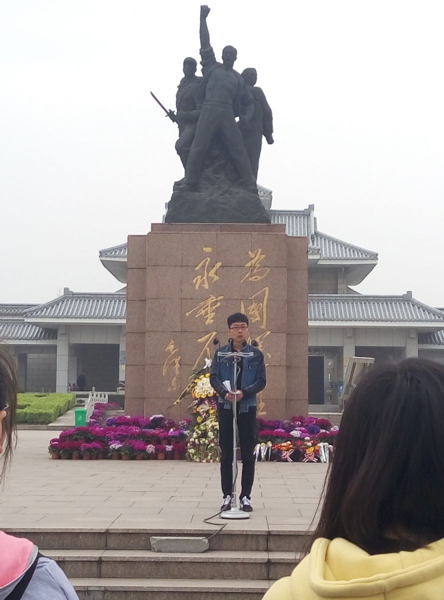 在主持人王清宣布仪式开始后,全体陶学子在烈士墓碑前低头鞠躬并默哀三分钟,以表达对先烈的哀悼。随后,王清讲述了一些革命烈士的英雄事迹。这段发言仿佛重现了那段血雨腥风的战争岁月,中华民族的优秀儿女们为了人民的幸福生活,不惜抛头颅、洒热血的场景又浮现在我们眼前。