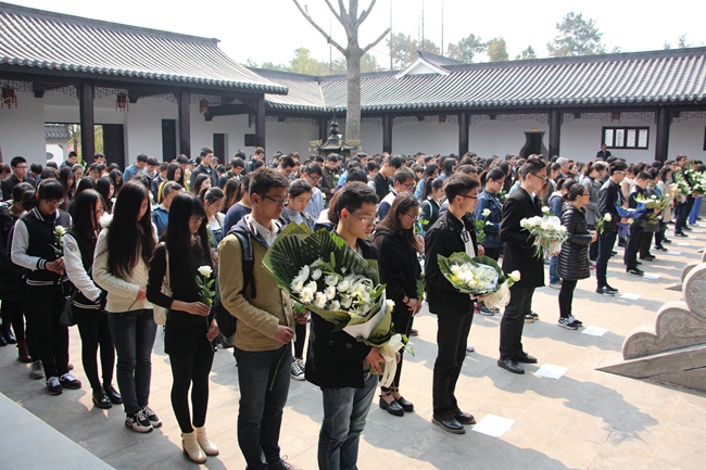在祠堂前,各代表在江苏陶欣伯助学基金会张利伟秘书长的指导下手捧鲜花,虔诚地为逝世三周年的刘奶奶三鞠躬,并默哀一分钟。随后南京晓庄学院的伯藜学社社长张腾月代表全体陶学子致祭祀文,表达对刘奶奶的怀念与感谢——“长者已逝,但遗德永存”。