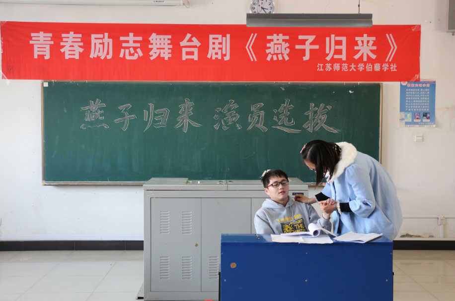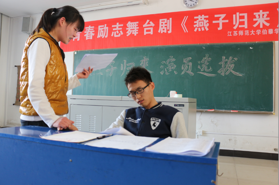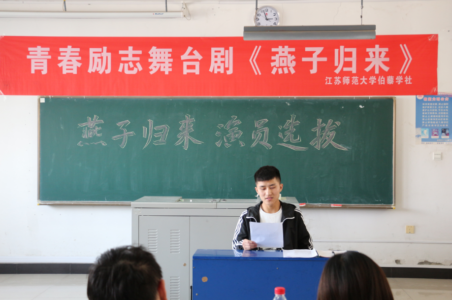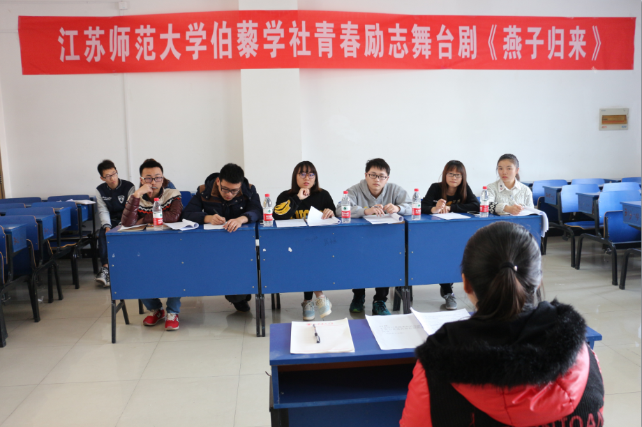 三月,春风送暖,草长莺飞。在这春意盎然的时刻,江苏师范大学伯藜学社励志舞台剧《燕子归来》又迎来了新的进展,正式进入角色选拔阶段。为了考核参选者的综合能力,给舞台剧排演工作的顺利开展挑选出一批高素养的演员,2016年3月16日,我社在泉山校区8号楼209教室进行了舞台剧角色面试。本次面试由舞台剧主要负责人即我社副社长王洁主试,我社社长刘辉和副社长许尔旭协同参与面试,并特邀我校雷雨剧社社长林岱羲担任评委。
