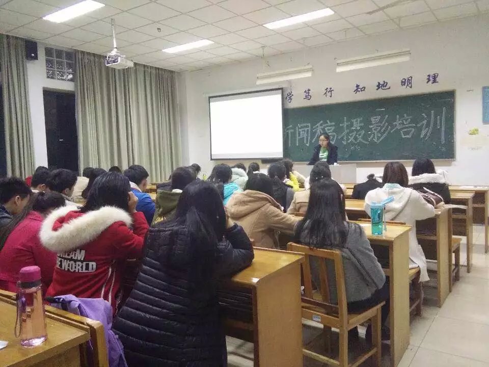 2016年3月18日晚上6点30分,在南京晓庄学院叔愚楼103教室开展了新闻稿摄影培训活动。这场活动负责讲解的是我校莫愁校区新闻传播学院的蒲思宇和朱亚园两位陶学子。参加这场活动的有文宣部部长艾梅以及部分陶学子。在活动中,陶学子们都认真地听着。