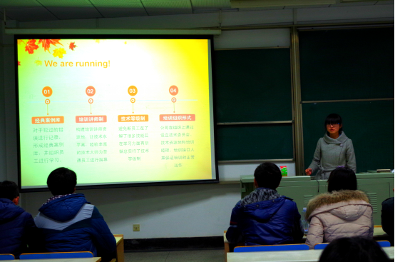 在主持人孙晓为大家介绍了到场的嘉宾以及活动流程之后,东南大学伯藜学社“谁是接班人”活动展示正式开始。孙宁小组率先上台展示,他们小组的任务是采访世界500强HR。经过前期的调研与筛选,他们最后的目标是华为公司,通过各方面的努力,孙宁小组最终采访到了华为公司某部门经理,并与其进行了深入交流。紧接着是覃炜小组做展示,他们小组的任务是购买100元商品卖出后获得100元以上净利润,覃炜小组联系了残障人士中心,购买了他们的手工艺品,同时利用学社库存的物资,用这些物品在学校进行爱心义卖,最终获得1000+净利润,并把所获钱款尽数捐给了残障人士中心,最后覃炜小组呼吁大家:奉献点滴关爱,共享一片蓝天。最后是李东源小组与李晓婷小组上台展示,他们的任务分别是:前往夫子庙与路人合唱歌曲以及参观南京地区某创业园,小组组长分别向大家介绍了活动过程,完成度及自我感受。