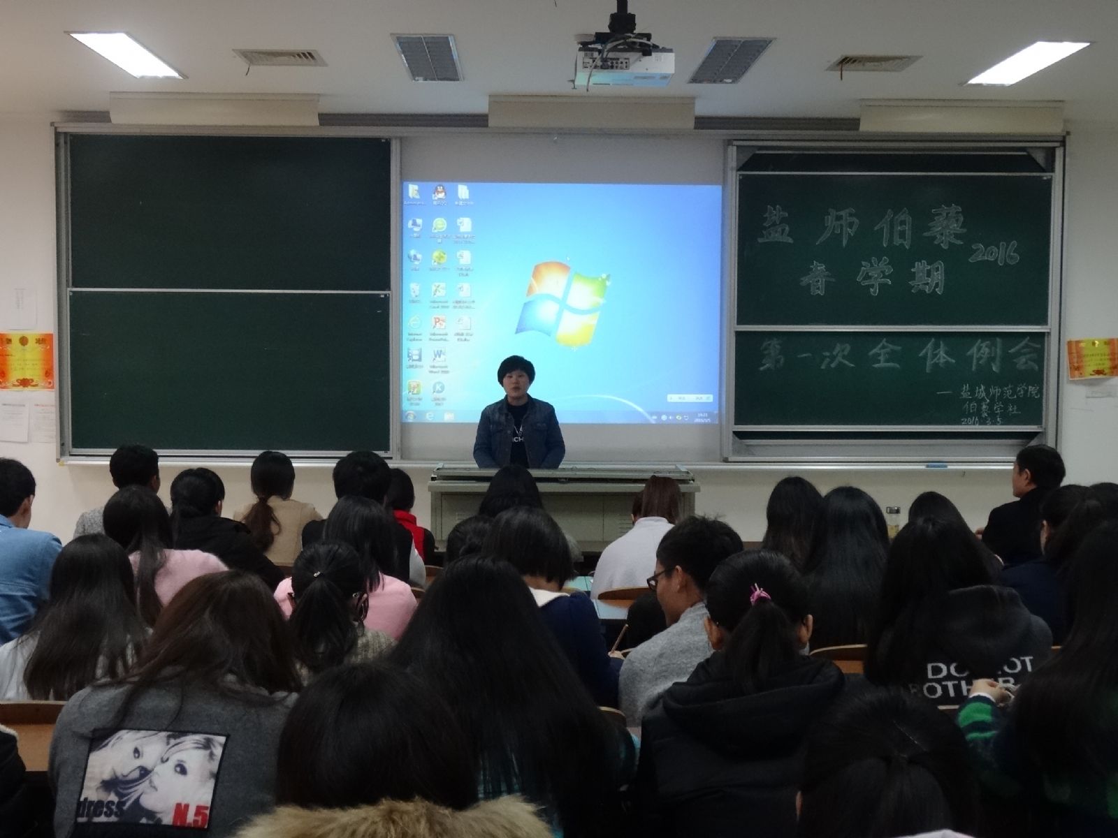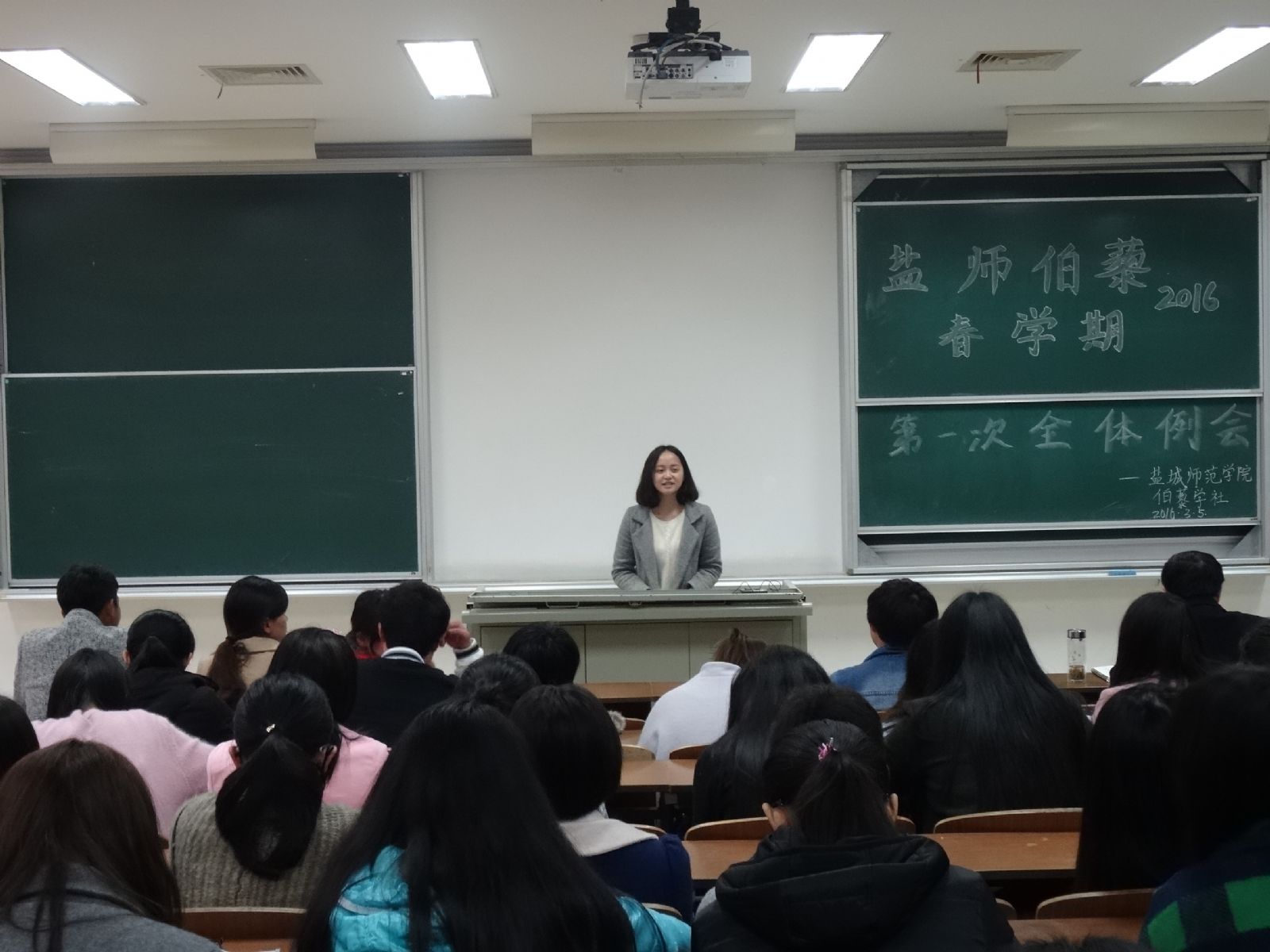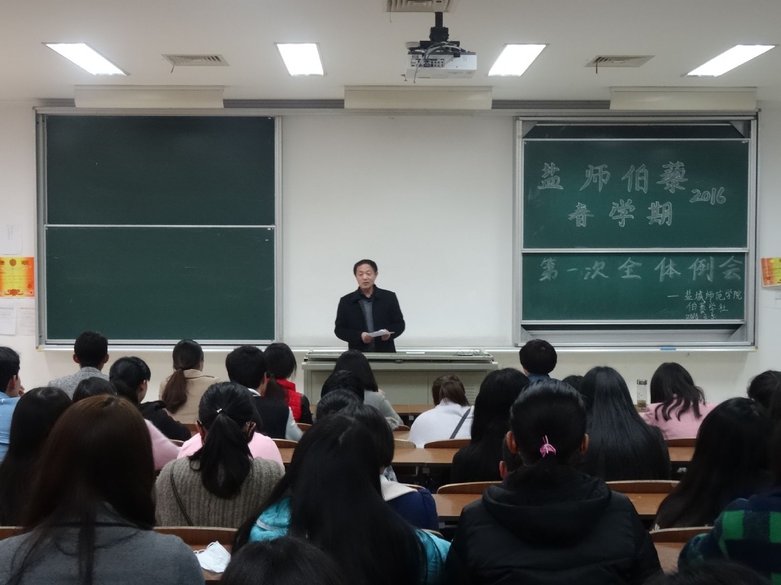 2016年3月5日14:00,盐城师范学院伯藜学社在通榆校区主楼B204召开了本学期第一次全体会议,学工处处长刘耀斌和指导老师谢莉俐出席了此次会议,会议由社长齐硕主持。