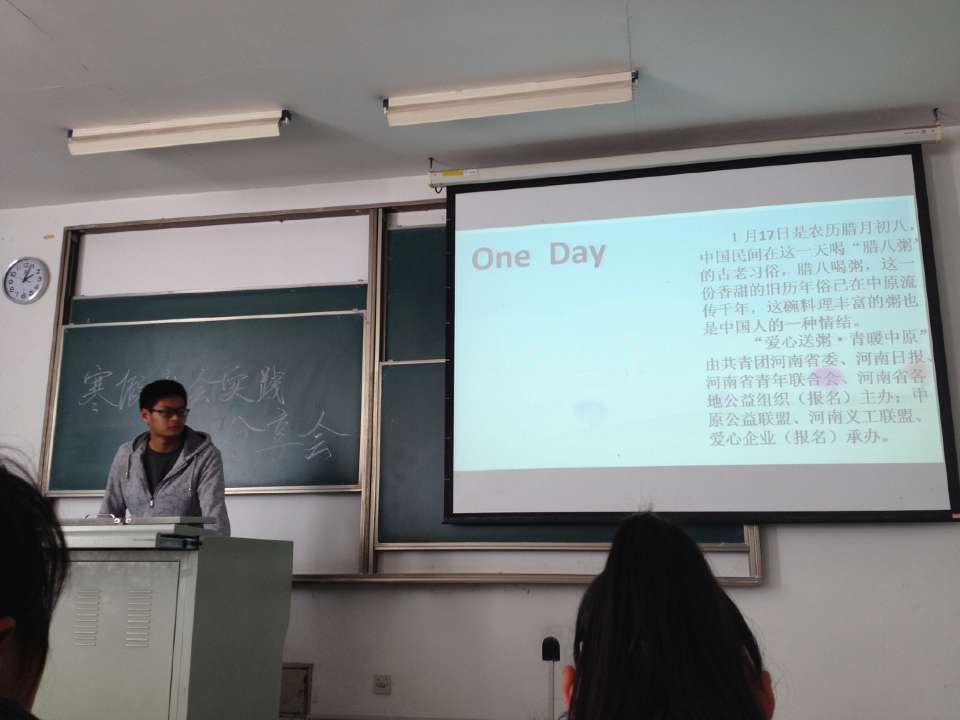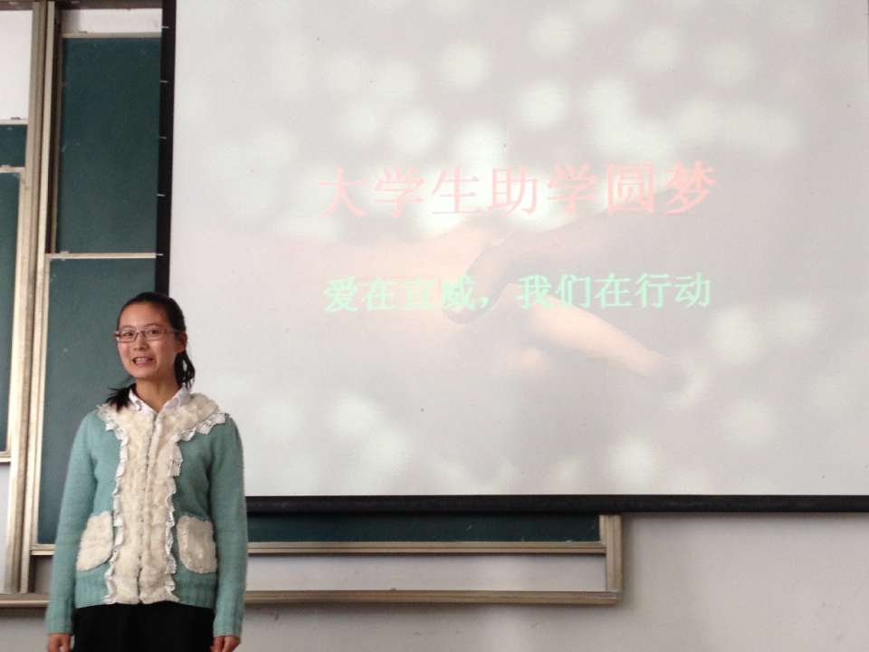 首先是谭小丹同学,她讲述了自己在寒假中参与的简爱基金组织举办的“在爱中行走”徒步旅行活动。分享了自己沿海南岛旅行途中的各种困难与快乐,认识了不少和善的朋友,让我们不禁为她的独立与坚强所感动。其次是刘静芳同学,她在台上慷慨激昂,描述了自己遇到的好多贫困家庭子女的励志故事,诉说了他们的辛酸与苦楚,给我们以很大触动。她有一句话让我们印象极其深刻:只要你努力了,你会成功的。最后是刘鹏程同学,他比较会说家常,整个场面控制得很轻松,悠悠闲闲地讲完了自己寒假期间做的公益实践,有“爱心送粥”、“慰问抗日老兵”等,同时还讲述了自己在酒店打工的一系列事情,分享了一些经验,给人以极大的启发。