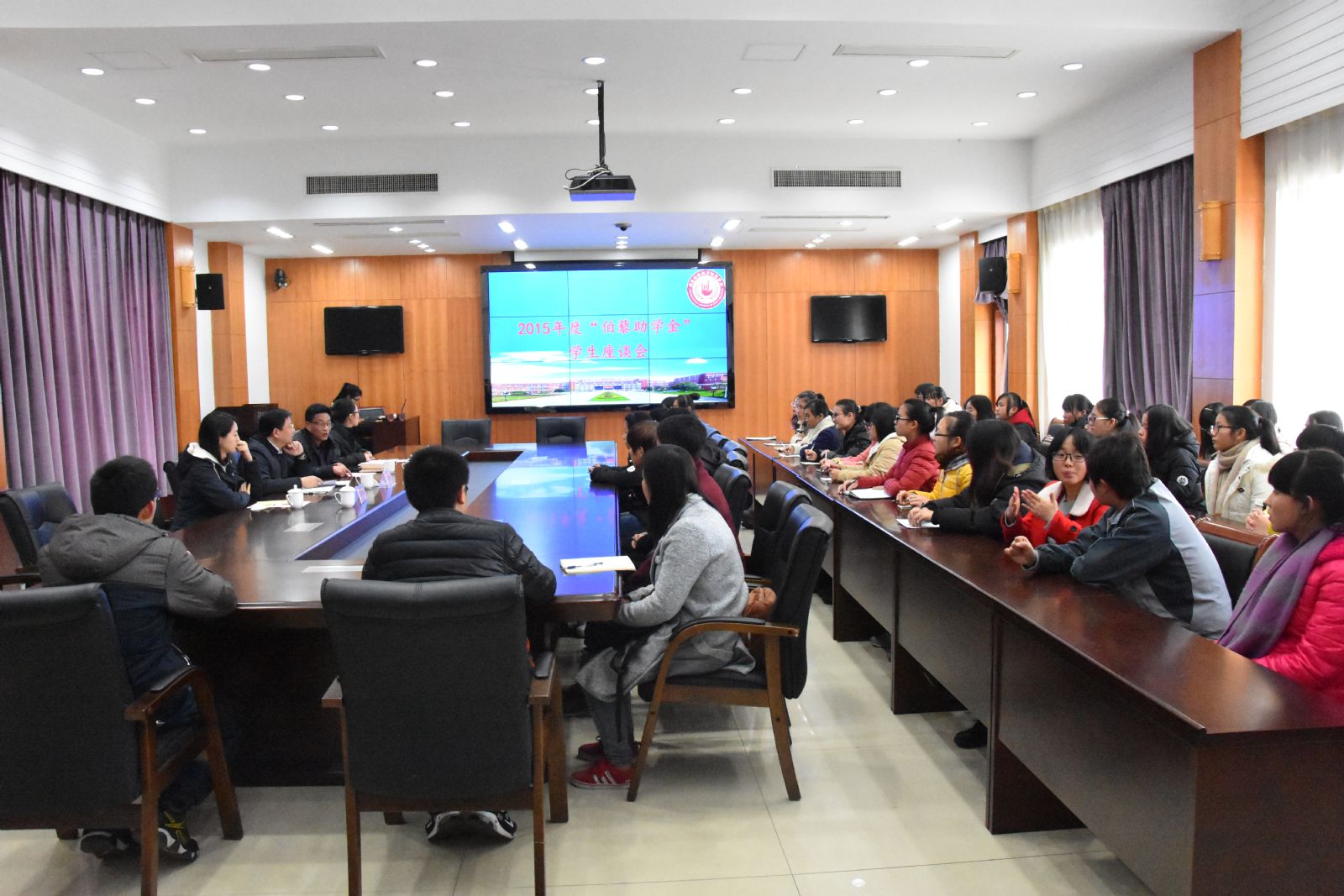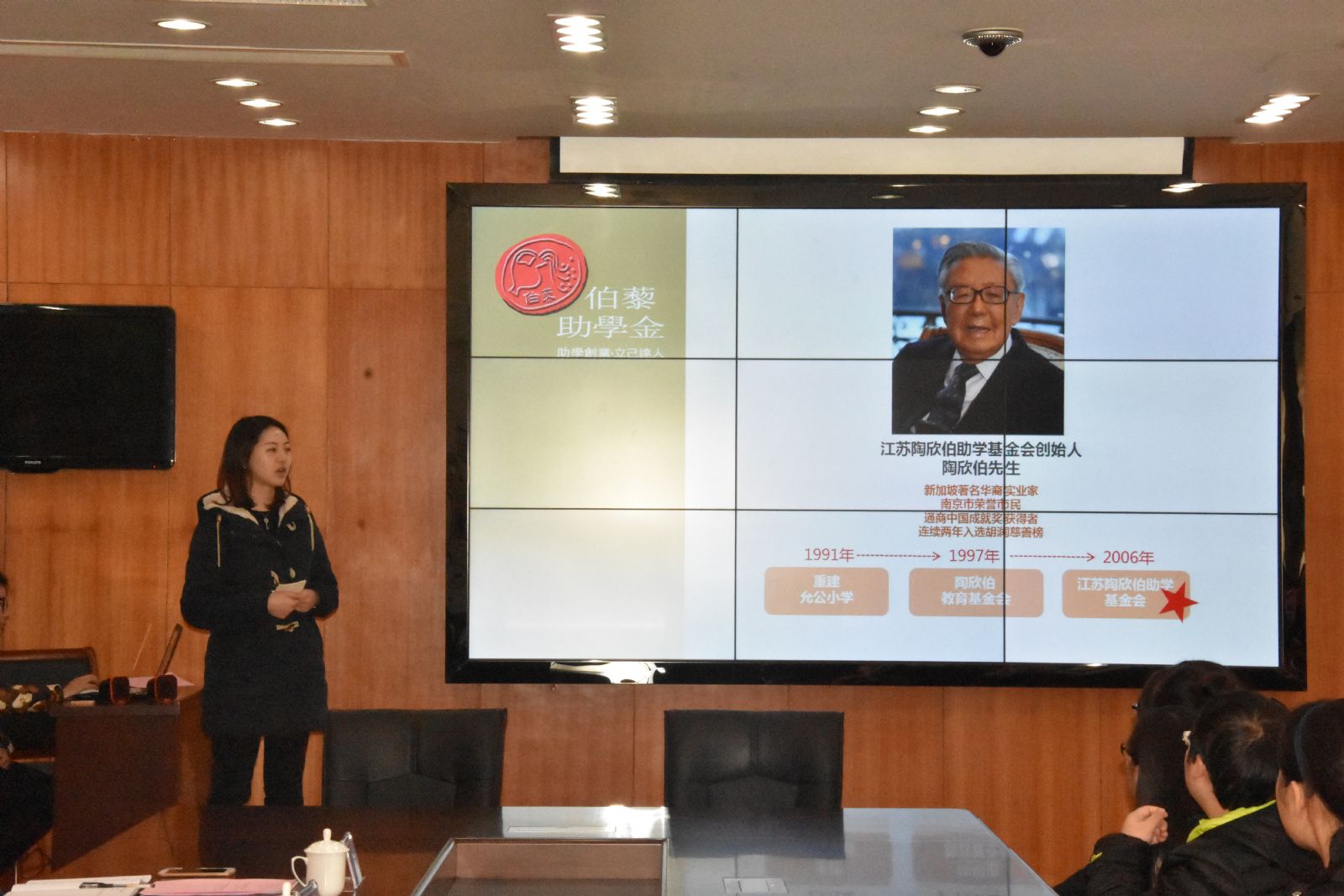 2015年12月29日下午,江苏陶欣伯助学基金会2015年度“伯藜助学金”管理工作座谈会在南京特殊教育师范学院水上报告厅顺利召开。江苏陶欣伯助学基金会秘书长张利伟、江苏陶欣伯助学基金会宣传策划部项目秘书周思远、我校副院长谭忠、学生工作处处长葛根宝、团委书记李宏伟、招生就业办公室副主任胡洪全以及伯藜学社指导老师冷晴出席了本次座谈会,我校伯藜学社社团负责人及部分陶学子参加了本次座谈会。