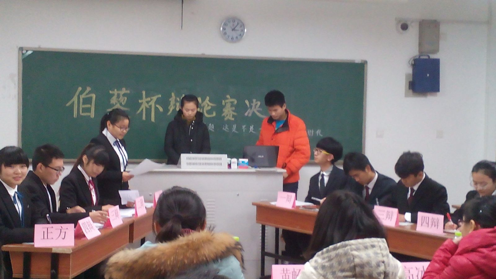 12月20日下午2:30,扬州大学伯藜学社“伯藜杯”辩论赛决赛如期而至,经过前两轮的比拼后,胜出的两支队伍开始了这场擂主的争霸。伴随着主持人李笑玲精彩的开场白,比赛正式开始了。