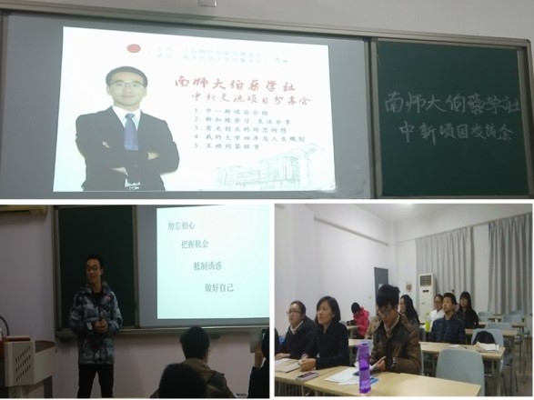 12月23日18:00,伯藜学社中新项目交流会在南京师范大学学明楼举行。这次交流会由12级体科院的高翔同学主讲,主要分享了他在中新交流项目中及他在大学四年学习生活的感悟。参加本次交流会的有13级、14级、15级的陶学子。