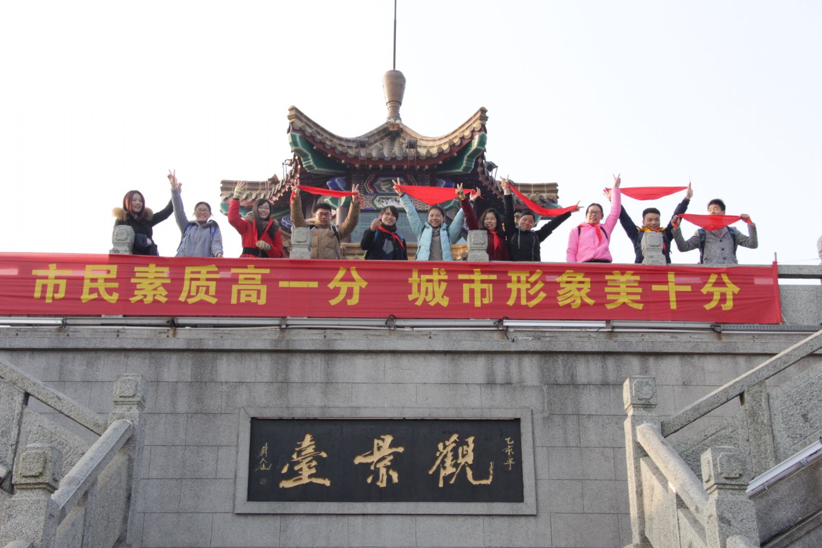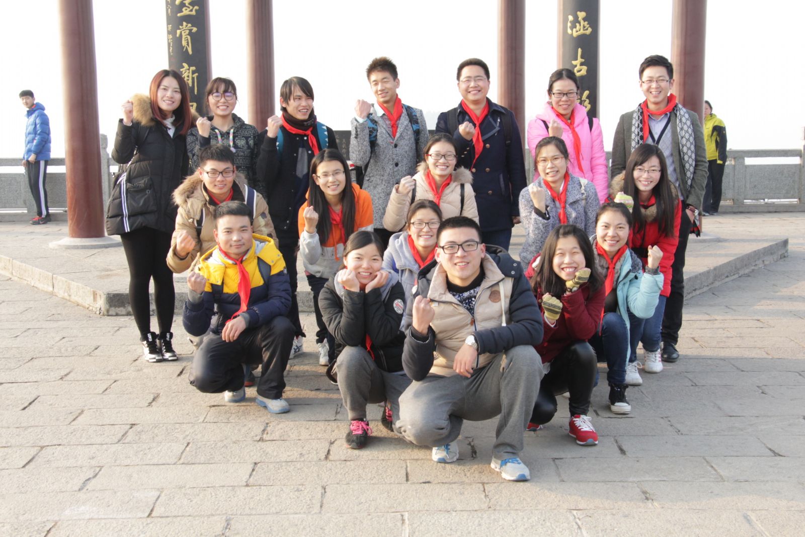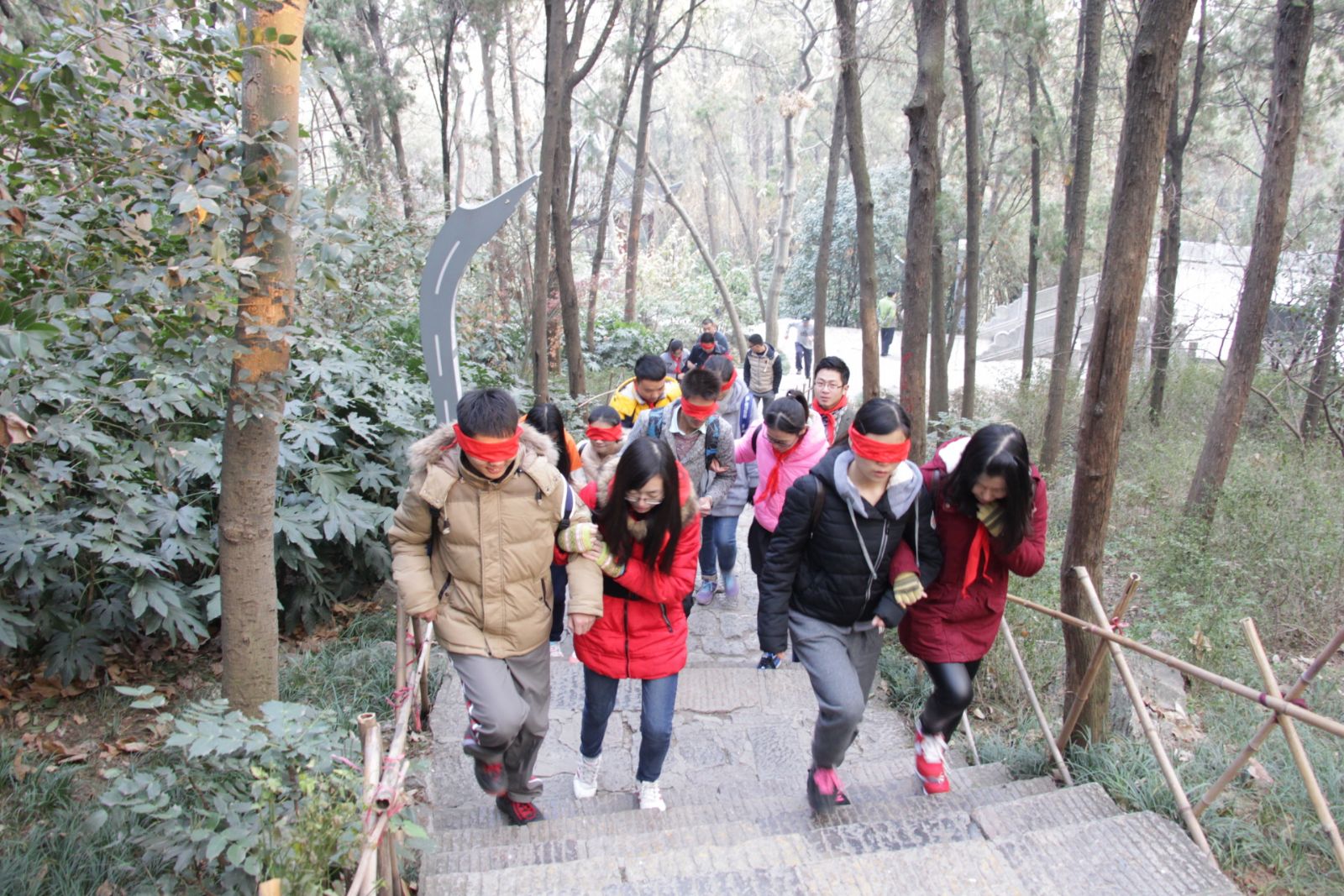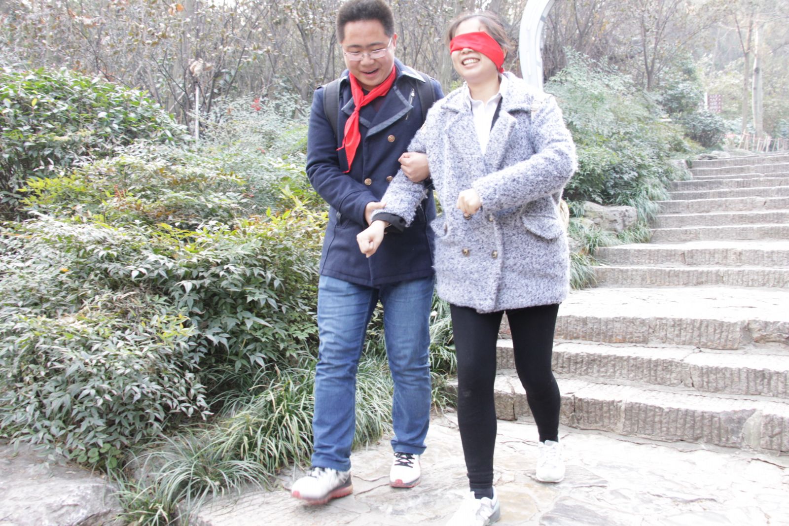 13日上午8:00,骨干们在刘辉社长的带领下早早地就来到云龙山脚下集合,开始了更为刺激的户外素质拓展训练。具体规则是:以部门正副部为一组,二人轮流被布蒙住双眼,合作爬到云龙山山顶的观景台上,然后再返回山脚。挑战开始前,骨干们望着坑坑洼洼的石头和一眼无际的台阶,内心都十分忐忑,但在身旁伙伴的不断鼓励之下,就大胆的蒙上双眼踏上了登山之路。“平地直走,台阶,准备开始上,一二一,上,上,上”,云龙山上回荡着骨干们细心指路的声音。刚开始大家的节奏都比较缓慢,但随着双方信任度和默契度的逐渐提高,登山的步伐越来越快,合作双方的心也越来靠越近。当终于成功登上观景台,看到山下美景时,每个人的心境都变得豁然开朗,伙伴们一展欢颜的画面定格在在云龙山顶,成为脑海中不可磨灭的亮丽风景。
