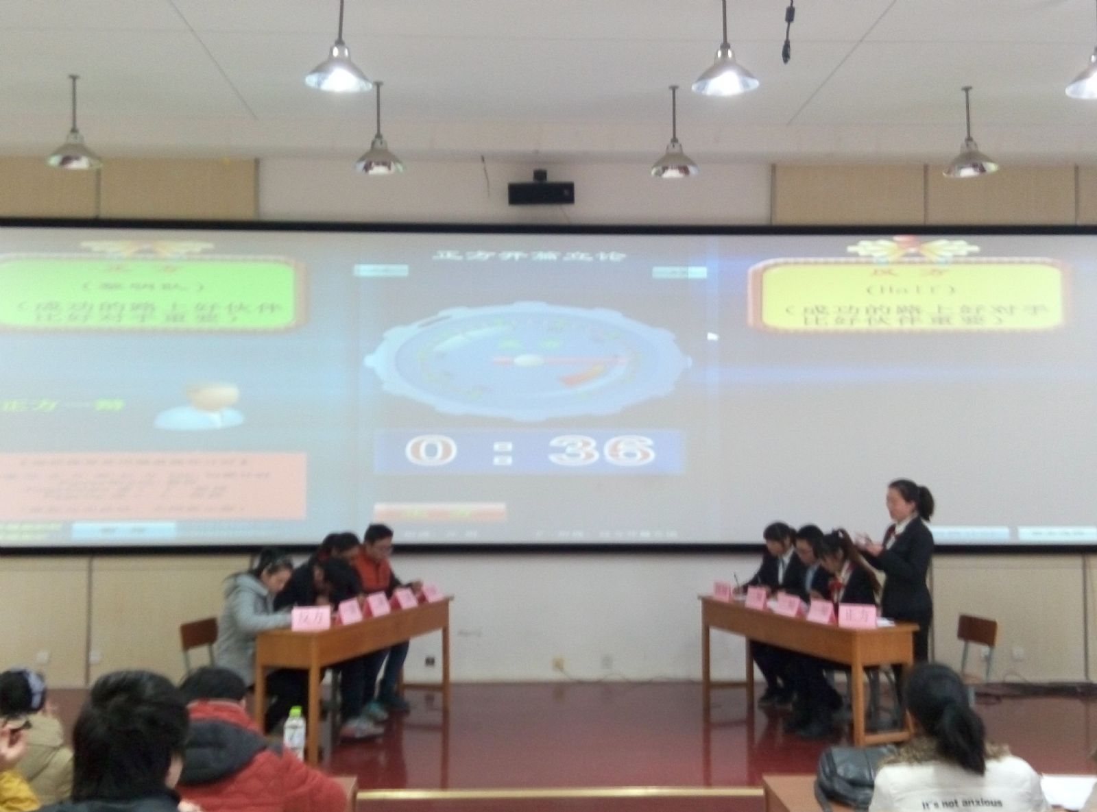 12月13号下午2:30,扬州大学伯藜学社“伯藜杯”辩论赛半决赛在扬子津校区笃行楼举行。比赛分两场:第一场辩论以“成功路上伙伴重要还是对手重要”为辩题进行辩论,第二场辩论双方就“结婚应该选择你爱的人还是爱你的人“为题进行辩论。