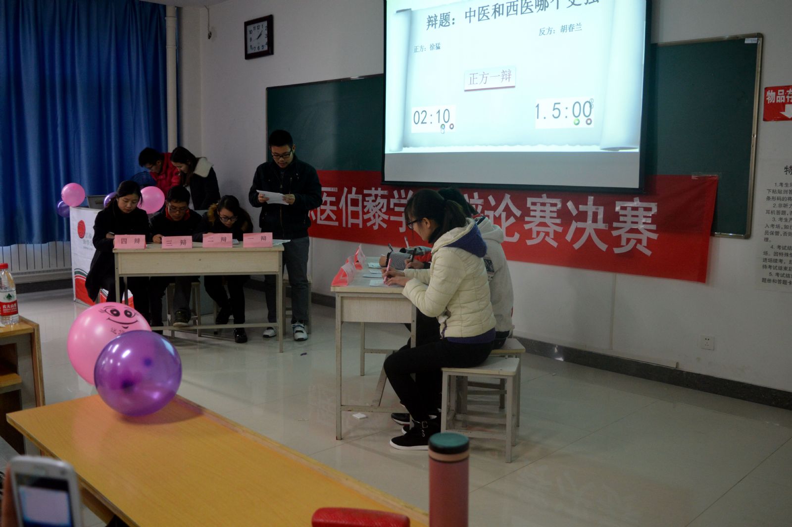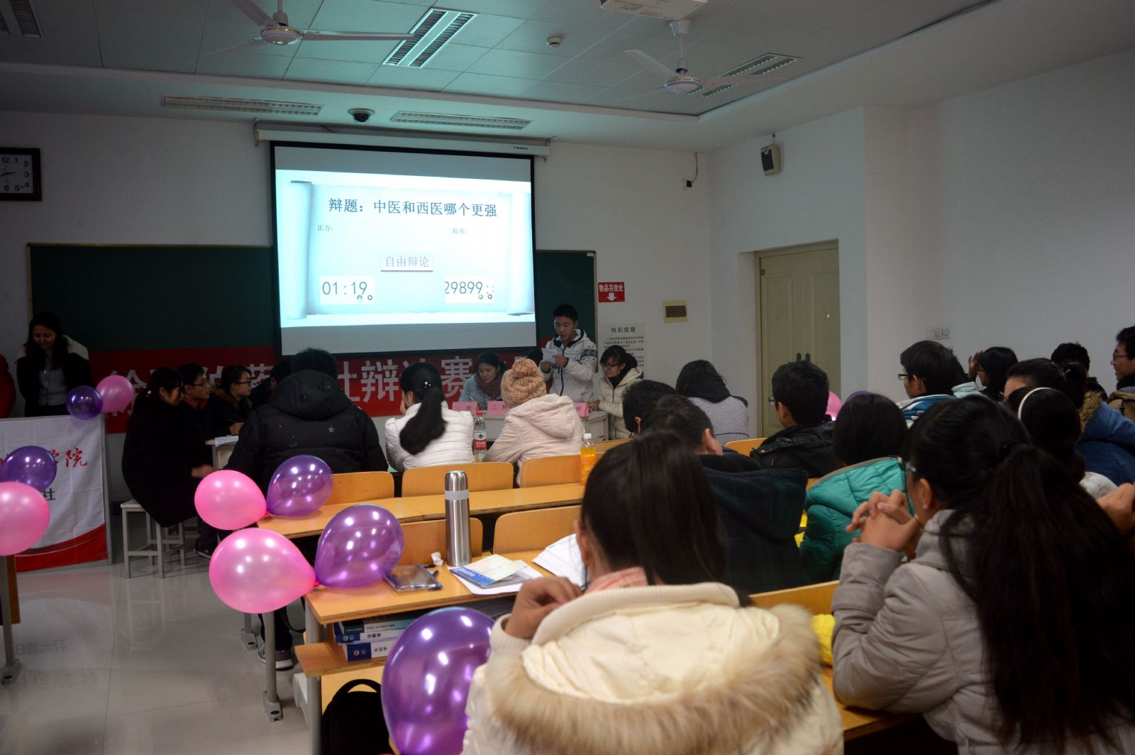 主持人简要的介绍了辩论赛的比赛规则及时间后,比赛正式开始。双方一辩用高度概括性的陈述为本场辩论赛开篇立论。正方一辩徐猛从中医的价格、治疗疗效以及历史长远等角度为切入点,用通俗的快板式语言陈述“中医比西医强”的观点。反方一辩王静则从西医对人体生理解剖学见效快、分科明确、治疗普遍性等方面出发,进行层层剖析,论证“西医比中医强”的观点。辩手们凭借精辟的措辞,犀利的言语,拉开了辩论的序幕,教室里响起了阵阵掌声。在随后的攻辩环节,双方更是机智应变、妙语连珠,现场气氛迅速升温,达到了白热化阶段。大赛继续进行,进入自由辩论环节。正方以诺贝尔生理学奖获得者屠呦呦创制新型抗疟药青蒿素为例,指出中医未来发展前景广阔,将会给人类带来福音,慷慨激昂的发言展现出强大的气势,反方辩手也毫不示弱,他们从现代医学领域谈起外科手术对杂症治愈的优越性等多角度论证了己方观点。赛场气氛紧张激烈,双方辩手针锋相对,唇枪舌战,你来我往,却又不失风度,侃侃而谈。良好的风范、出色的口才、敏捷的思维令场下观众为之折服,掌声不断。比赛进入总结陈词环节,正反双方辩手清晰的思路和巧妙的陈词给观众和评委留下了深刻印象。