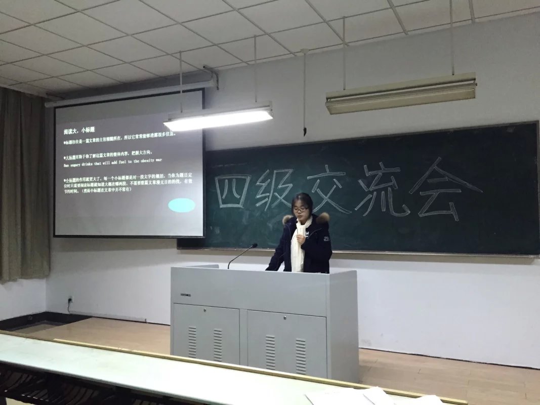 12月7号晚上八点半,南京晓庄学院伯藜学社在元培楼303开展了一场关于英语四级的交流活动。会议由伯藜学社学习部部长瞿南芳主持,主要内容是分享一些关于英语四级考试的技巧和方法。瞿南芳部长还特意邀请了食品科学学院院大二的张莹洁和张莹莹来参加这次分享交流会。