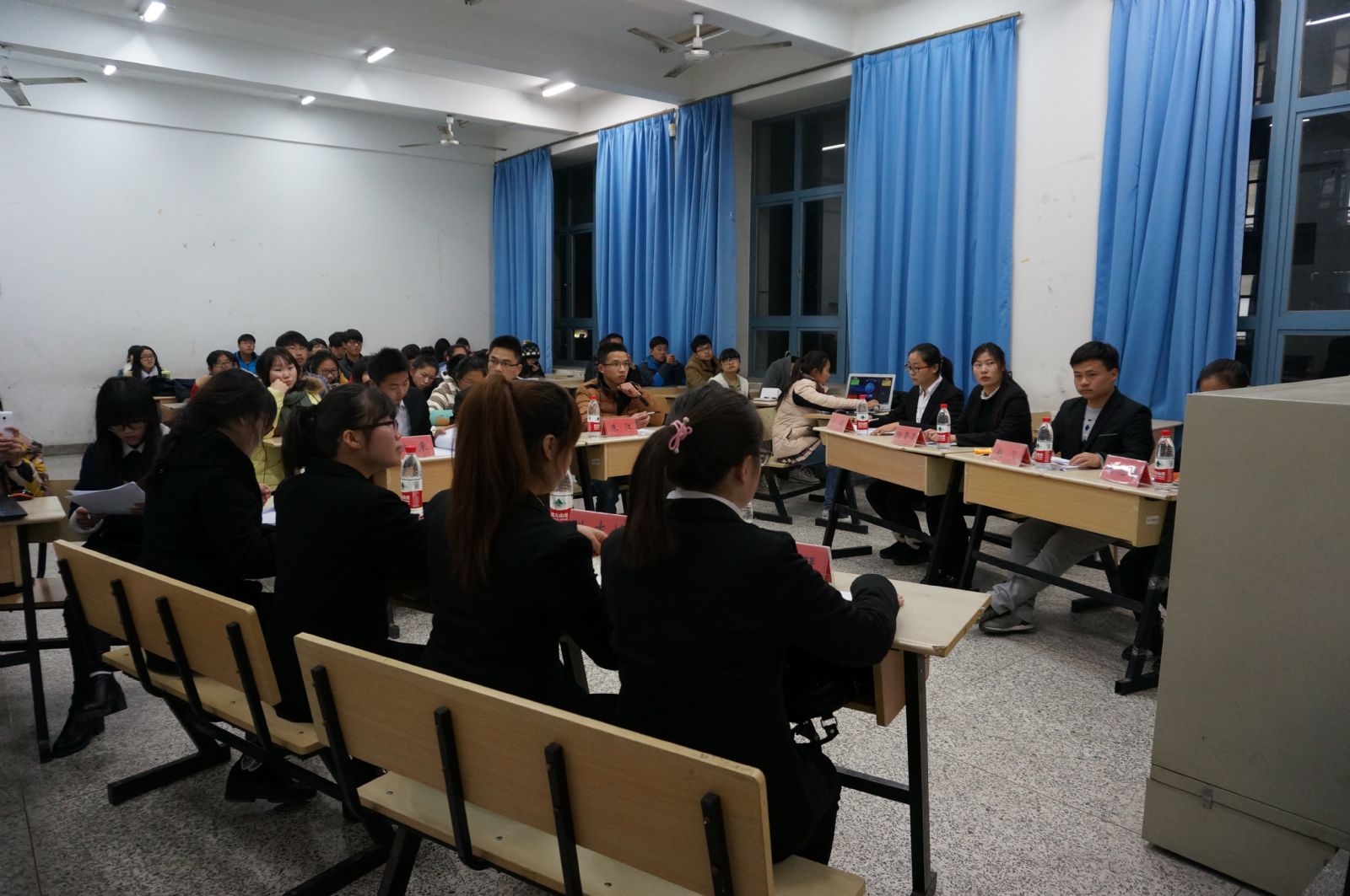 本次活动由副社长孔维朕担任主持人,社长满家磊、副社长魏来以及辩论社的资深导师朱江担任评委。活动开始,主持人介绍了此次辩论赛的辩题——“大学生毕业后应该先深造还是先就业?”,正方观点是先深造,反方观点是先就业。在介绍完基本流程和评分标准之后,主持人宣布此次辩论赛正式开始。然后,身穿正装的正反方选手依次入场并和评委握手示礼。比赛开始,在立论阶段,先由正方一辩开篇立论,声明观点——大学生毕业后应该先深造,再由反方一辩开篇立论,声明观点——大学生毕业后应该先就业。之后是双方互驳对方立论,辩论的过程中,双方所有成员都按照基本流程各持己见,实力相当。到了质辩环节,双方更是以考研与否的热门话题进行论证分析,赢得了在场观众热烈的掌声。每个辩手发言的时间都有限,但是所有辩手的表现都很出色。最后比赛结果是,正方略胜一筹,评委选出最佳辩手并对其嘉奖。