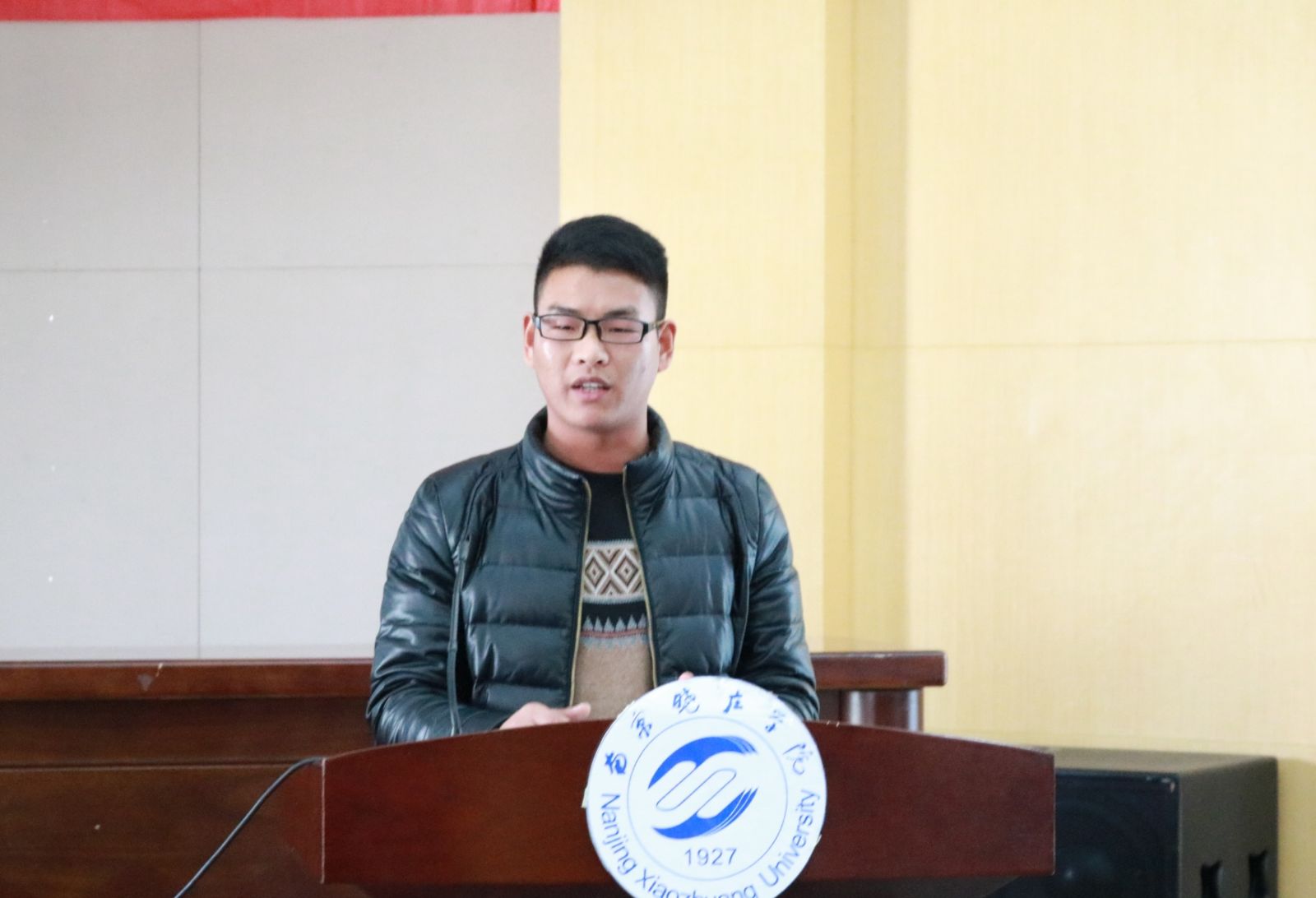 会议进行的第二项是南京晓庄学院伯藜学社14届陶学子代表发言。代表老生讲话的是吴响超同学。他根据这一年中所参加的伯藜学社举办的活动,说出了自己的想法。对于大学四年,他也给新生们分享了自己的心得。他说道,从开始的迷茫到确定自己的方向,需要一个过程,要大家不要着急,从自己的实际出发,寻找适合自己的方向。作为一名陶学子,他也表达了对陶爷爷,对基金会的感激。