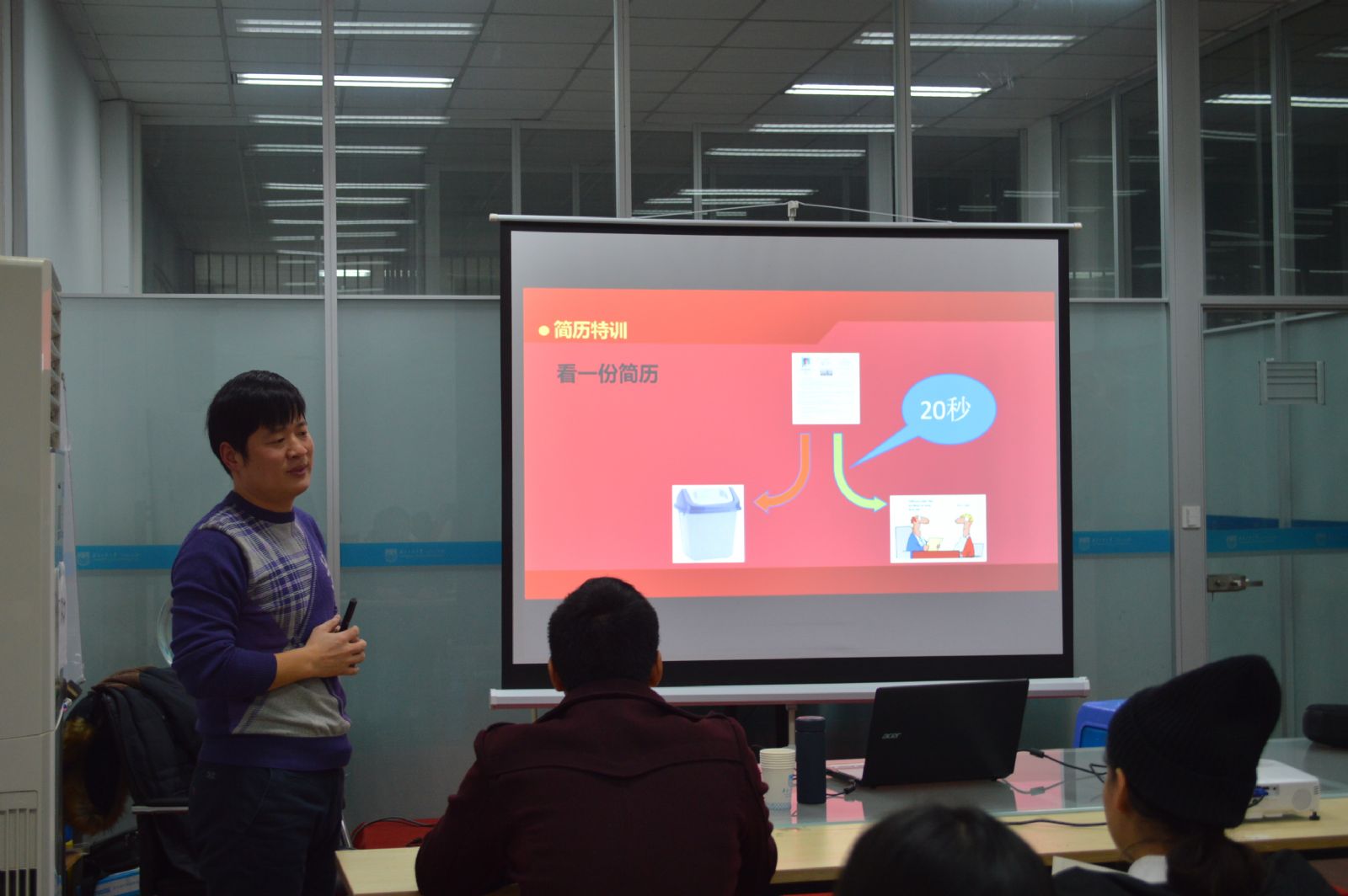 此次活动开始的时候刘全振老师给我们看了几张以前同学做的不合理的简历,老师以幽默搞笑的话语对这些简历进行了点评。对于我们的简历,老师说了一句“简历不是写出来的,是用脚走出来的”我们四年的经历浓缩成我们一份精美的简历,让我们在四年中为自己以后的工作努力奋斗打了一剂强心剂。接着就进入了我们此次活动的简历的专题辅导,一句“简历要打造个人的职业品牌”给我们每个参加活动的陶学子都留下了深深地印象。老师以“鸭子”的特征来向我们讲述简历就是我们自身的特性,要让招聘单位一眼就看到他找的“鸭子”特征明显而又鲜明。讲完这些后,一句话“我适合做什么”让我们对自己的职业方向有了进一步的思考。最后老师,讲了好简历的“金标准”: