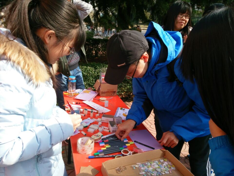 在义卖过程中,同学们主动地去拉客户,自信地宣传自己的产品,吸引客户前来购买,还有一个小组用气球制度手工艺品送给购买东西的客户,深受客户的好评。在本次义卖会上购买东西的客户可获得一次抽奖的机会,奖品为相框,相框的背景图为春蕾项目活动的照片,并且可以给义卖的捐助孩子们写下你最美好的祝愿!