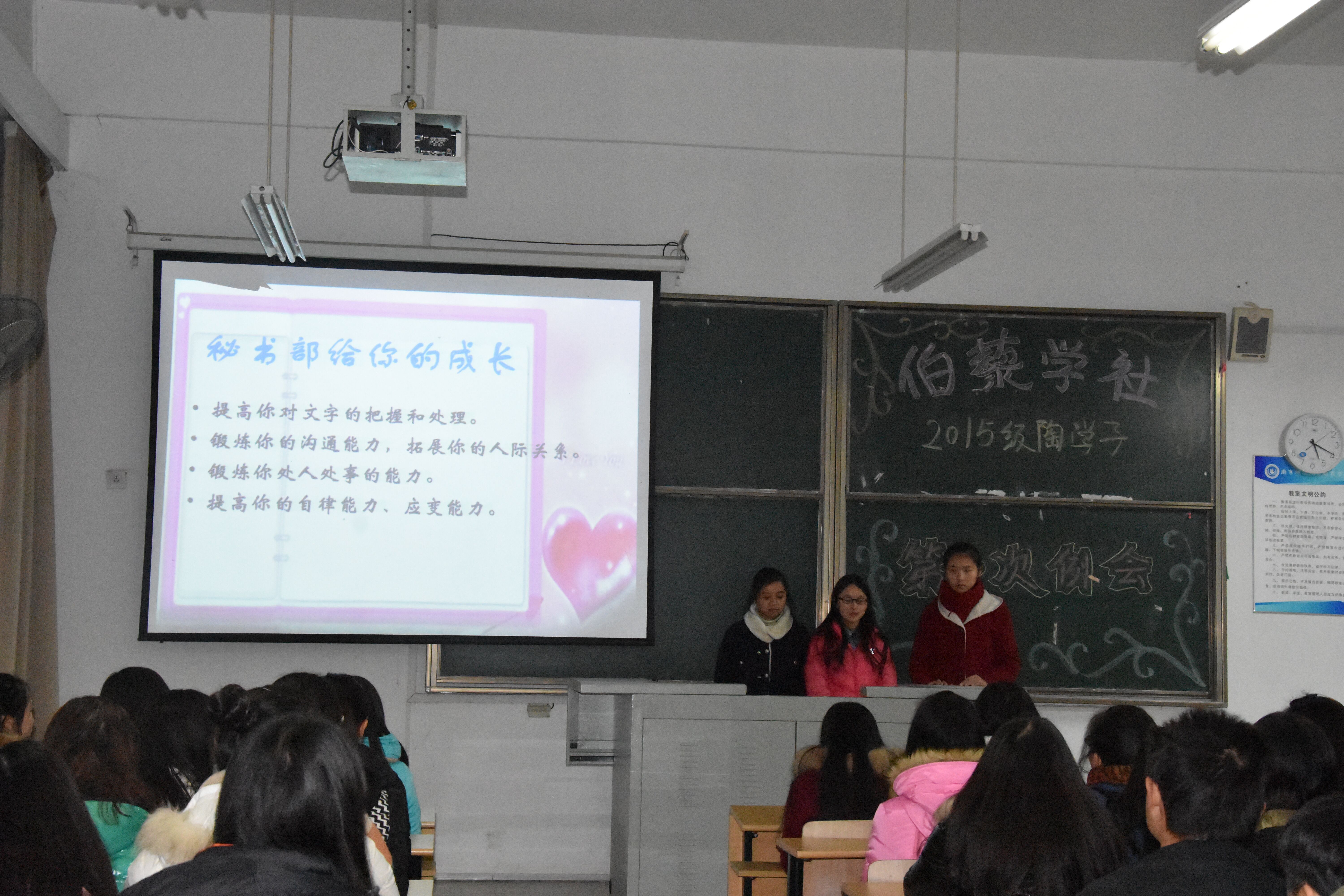 会议开始,社长郭宏宣布了此次会议的主要内容,是让大一陶学子自主选择进入各个部门,并向大家讲述了我校伯藜学社的部门组成,共有秘书部、宣传部、外联部、实践部和创业部五个部门。接着,开始进入部门招新。首先由秘书部部长杨薇及两位副部长介绍秘书部。包括了部门负责人的自我介绍、部门职务简介以及秘书部将给陶学子带来的成长三部分。秘书部部长提到了加入秘书部能提高陶学子对文字的把握和处理、能锻炼陶学子的沟通能力,拓展其人际关系等好处,激起了大一陶学子的兴趣。接着宣传部部长孙晓雪从部门负责人简介、部门职责、最后总结三部分介绍了宣传部的主要工作。在介绍中,孙晓雪同学展示了宣传部参与活动的照片,也提出了宣传部的工作内容及对未来部门的展望。外联部部长刘金凤对外联部进行了简单的介绍,提出要做好社团内部的工作、加强与社团内其他部门的联系和交流、积极与外校进行联谊以及对新成员进行技能培训等规划。刘金凤同学提到如果想结实更多的外系和外校的朋友,想锻炼与人交流的能力,外联部会是最好的选择。在实践部介绍时,部长杜家佳以“不想当将军的士兵不是好士兵”“万丈高楼平地起”来开头,希望陶学子们能在小事中锻炼自己,从身边的每件小事做起。紧接着,杜家佳同学介绍了实践部的主要职责,展示了部门参加实践活动的照片,使陶学子们更好的了解实践部。最后,由创业部部长仲岩介绍创业部。仲岩同学从“创业部是什么”、 “创业部做什么”和“创业部的发展”对创业部进行了一个总体性的介绍。仲岩同学以热情洋溢的话“快到碗里来”来邀请陶学子的加入。