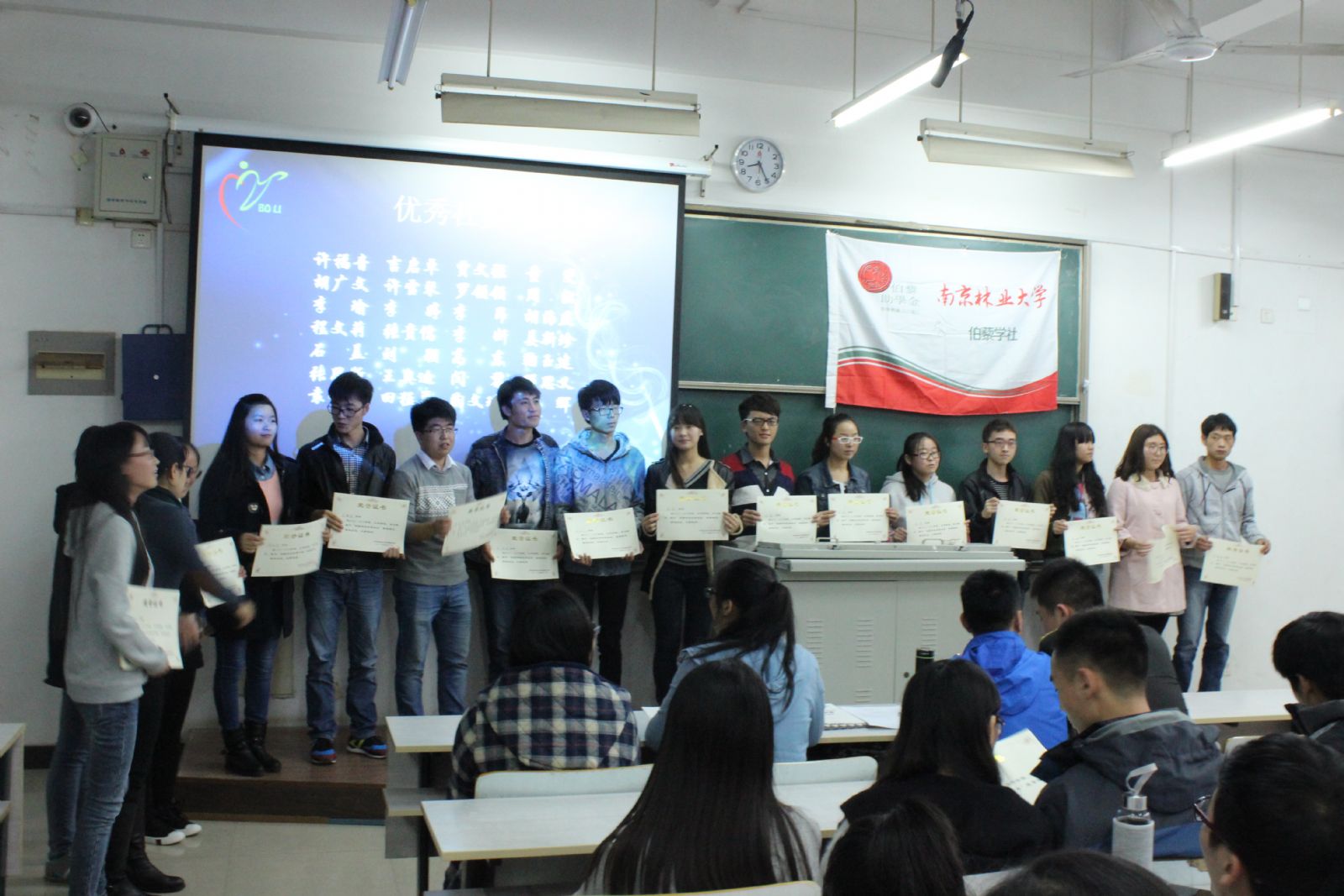 2015年11月7日18:30,南京林业大学伯藜学社在教五楼50117召开全团大会暨表彰大会。参与这次大会的有南京林业大学资助中心指导老师倪慧、伯藜学社社长石小霜、副社长吴波、伯藜学社秘书长徐欣、“教室文明巡视岗、校园文明巡视岗、曙光公社”三个兄弟社团的负责人、部分在校陶学子以及50名2015级陶学子。