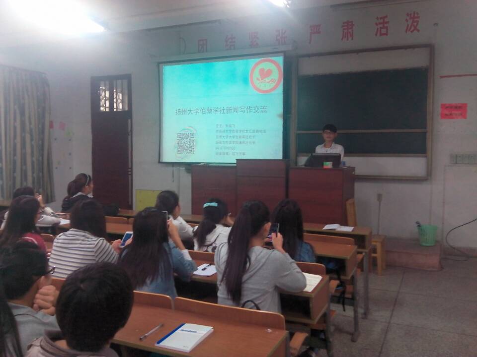 10月24日上午10点,扬州大学伯藜学社瘦西湖分社在理科楼202教室举行了伯藜学社活动新闻编写培训会。此次培训会邀请到扬州大学大学生新闻社社长朱猛飞作为主讲人,有瘦西湖社长徐倩、副社长廖丽平、三个校区的宣传部成员以及其他有新闻爱好方面的陶学子共同参与。
