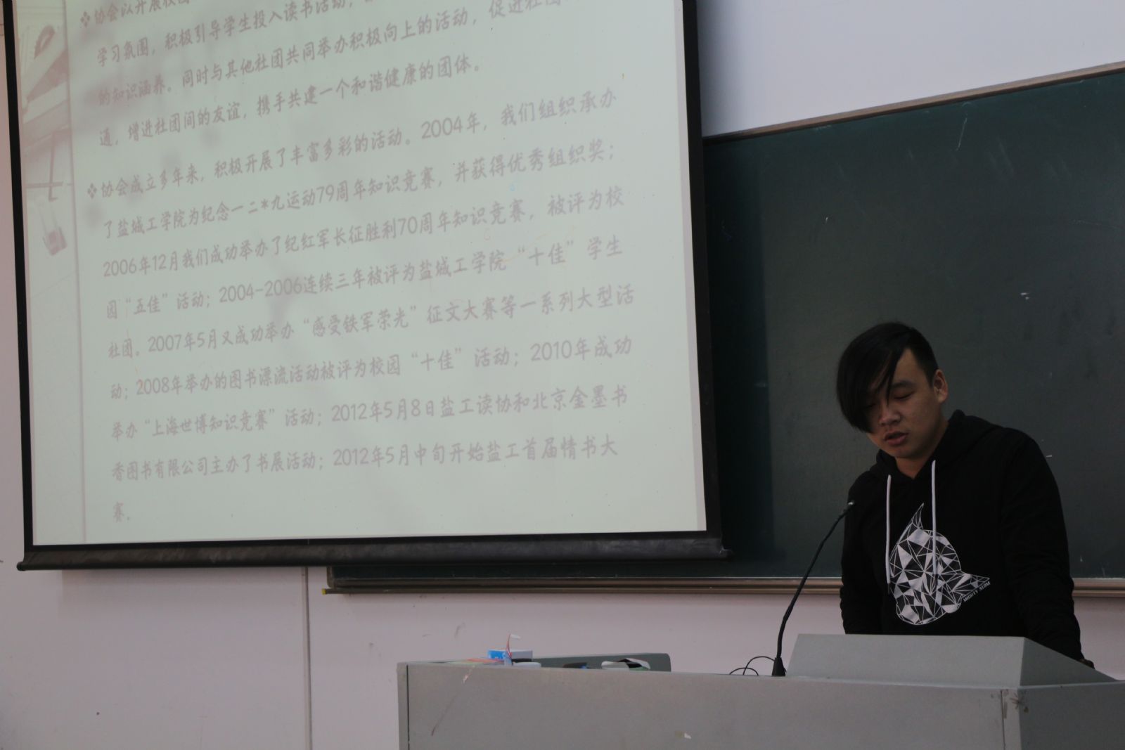 第一项议程是由两方代表各自对自己社团做了简单介绍。读协代表指出盐工读者协会自1997年成立以来,就以读书养性,服务大众为宗旨,是盐工图书馆唯一指导协会。接着伯藜学社代表张海跟借一段视频详细介绍了伯藜学社的成立历程,宗旨理念,发展规划和美好憧憬。其中陶欣伯爷爷苦难却又充满奋斗精神、爱国情怀的一生深深打动了在场的每一位人。