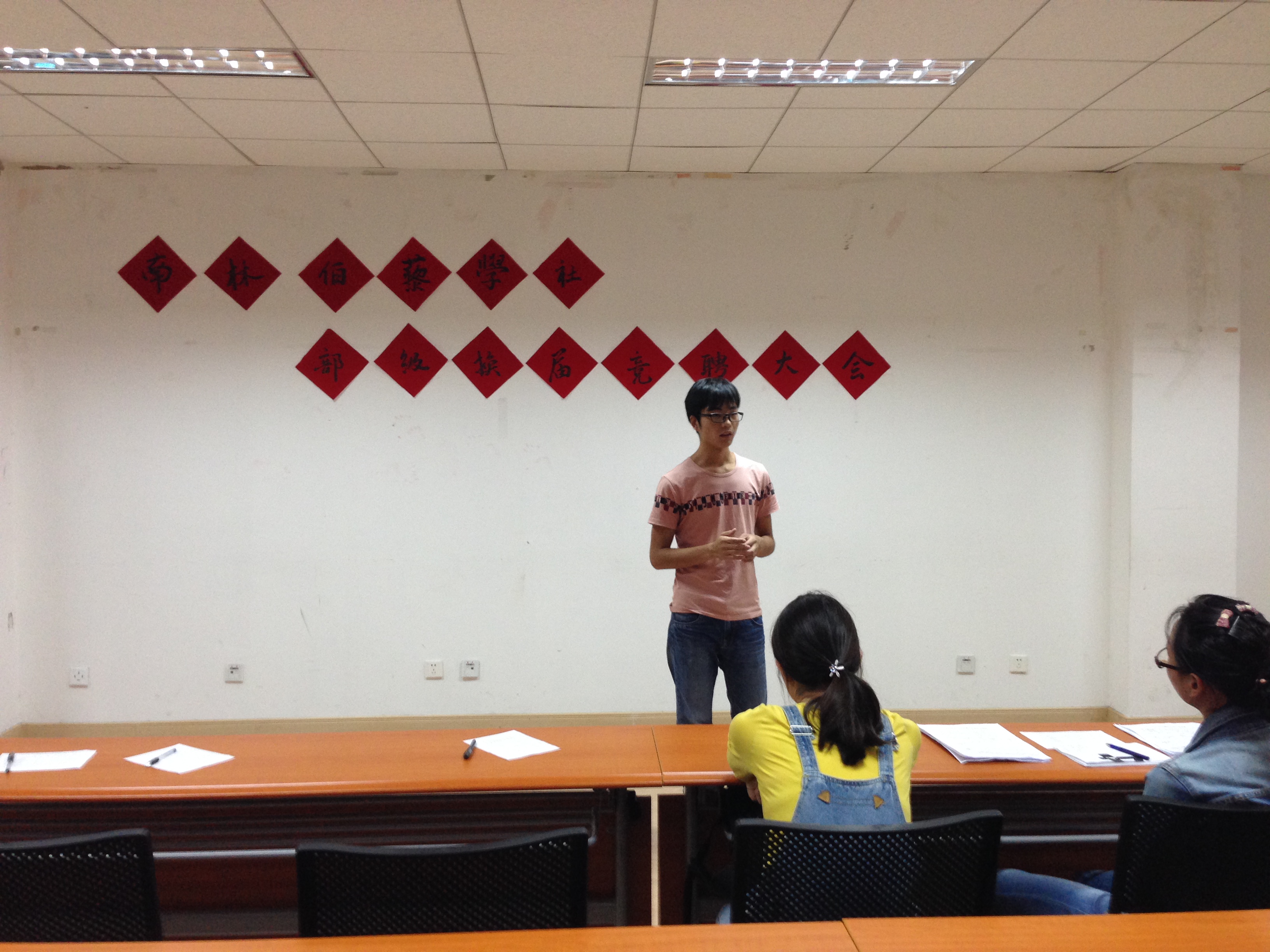 2015年10月22日下午四点,南林伯藜学社在南方学院报告厅召开了2015届部级正式干部竞选会。担任此次竞选评委的有资助中心指导老师倪慧、2015届伯藜学社社长石小霜和2014届活动部副部李萍。参与竞选的主要是学社各个部门14级社员。