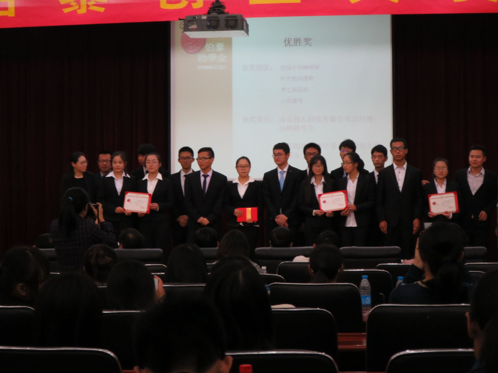 2015年10月17日中午12点30分,由江苏陶欣伯助学基金会主办,南京理工大学承办的2015伯藜创业大赛的决赛在南京理工大学科技堂圆满落幕。出席本次决赛的评委有江苏陶欣伯助学基金会秘书长张利伟先生、江苏陶欣伯助学基金会行政总监刘萍女士、江苏陶欣伯助学基金会项目主任丁琦女士、南京投石科技有限公司总经理孙峰峰先生、途牛品牌经理洪菊女士、国家级南京经济技术开发区科技招商部部长王正明先生、南京啡咖啡创业孵化器首席投资官陈东华先生以及南理工经济管理学院(创业教育学院)会计系主任徐光华教授。
