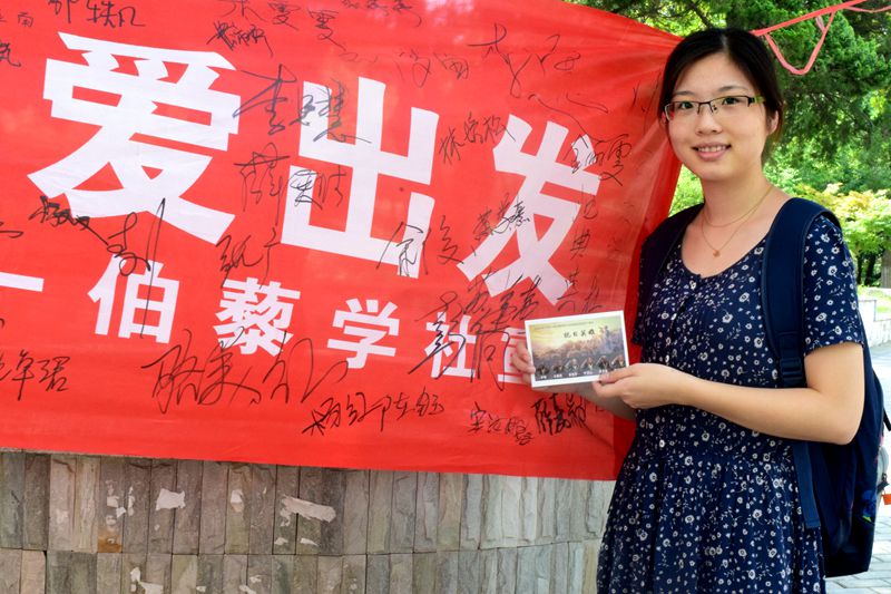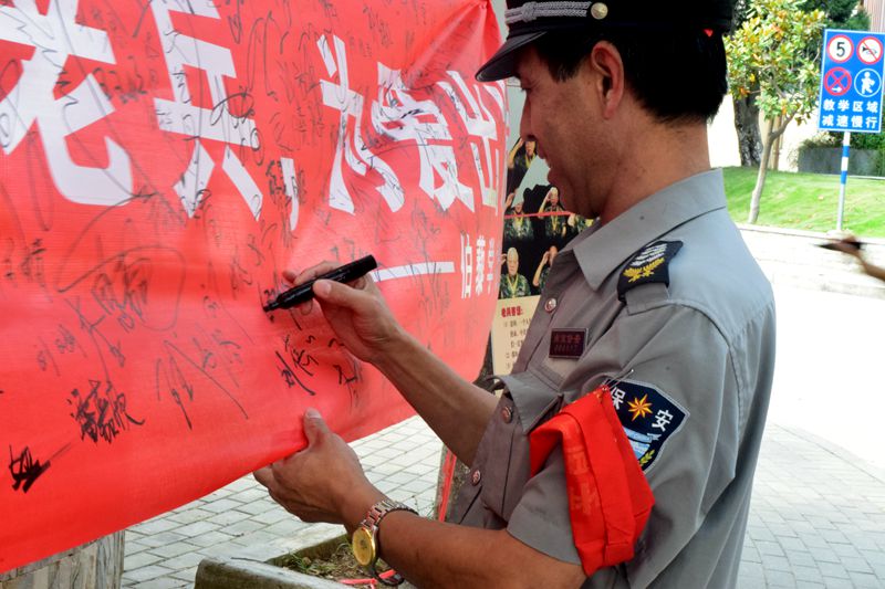 上午九点,玉兰路上已有陆陆续续的同学们经过,陶学子们准时集合在大学生活动中心。我们不但主动邀请路过的同学们支持我们的活动,一起缅怀先烈、感受大爱,并在我们的横幅上签名,还给驻足观看《抗战胜利70周年开幕式》的叔叔阿姨们免费赠送抗战纪念明信片。在现场的另一边,我们设计的抗战胜利70周年展板同样吸引了路人们眼光。三块展板,图文并茂,集中了过去一个月老兵寻访的过程中主要的成果。大量的路人被我们的活动吸引,与我们积极互动。